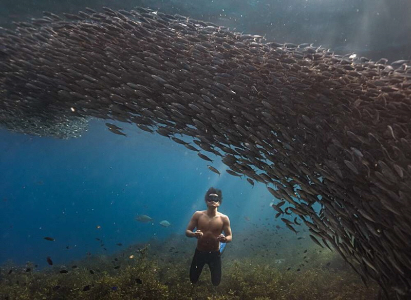 무리 진 정어리 때를 뚫고 지나갈 때의 놀라움은 설명이 불가능할 정도로 경이롭다.