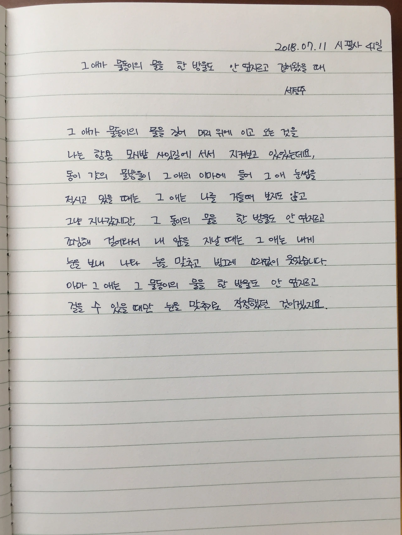 그 애가 물동이의 물을 길어 머리 위에 이고 오는 것을 나는 항용 모시밭 사잇길에 서서 지켜보고 있었는데요. 동이 갓의 물방울이 그 애의 이마에 들어 그애 눈썹을 적시고 있을 때는 그 애는 나를 거들떠 보지도 않고 그냥 지나갔지만, 그 동이의 물을 한 방울도 안 엎지르고 조심해 걸어 와서 내 앞을 지날때는 그 애는 내게 눈을 보내 나와 눈을 맞추고 빙그레 소리없이 웃었습니다. 아마 그 애는 그 물동이의 물을 한 방울도 안 엎지르고 걸을수 있을 때만 눈을 맞추기로 작정했던 것이겠지요.