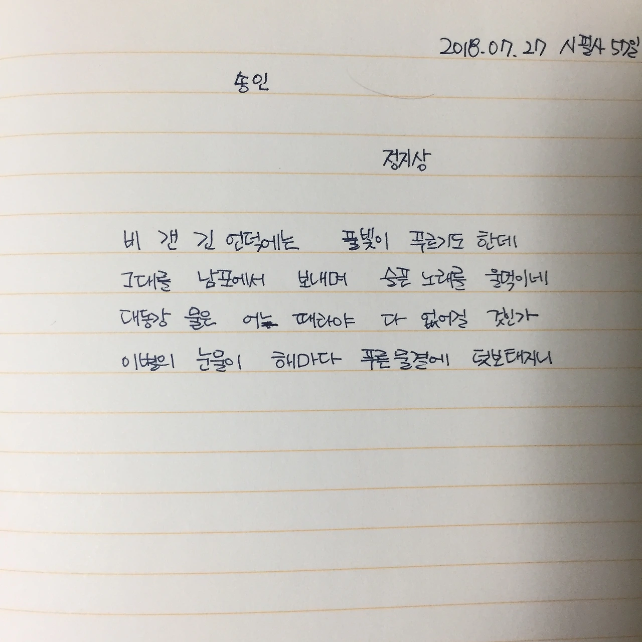 雨歇長堤草色多送君南浦動悲歌大同江水何時盡別淚年年添錄波비 갠 긴 언덕에는 풀빛이 푸르기도 한데그대를 남포에서 보내며 슬픈 노래로 울먹이네.대동강 물은 어느 때라야 다 없어질 것인가 이별의 눈물이 해마다 푸른 물결에 덧보태지니.송인, 정지상