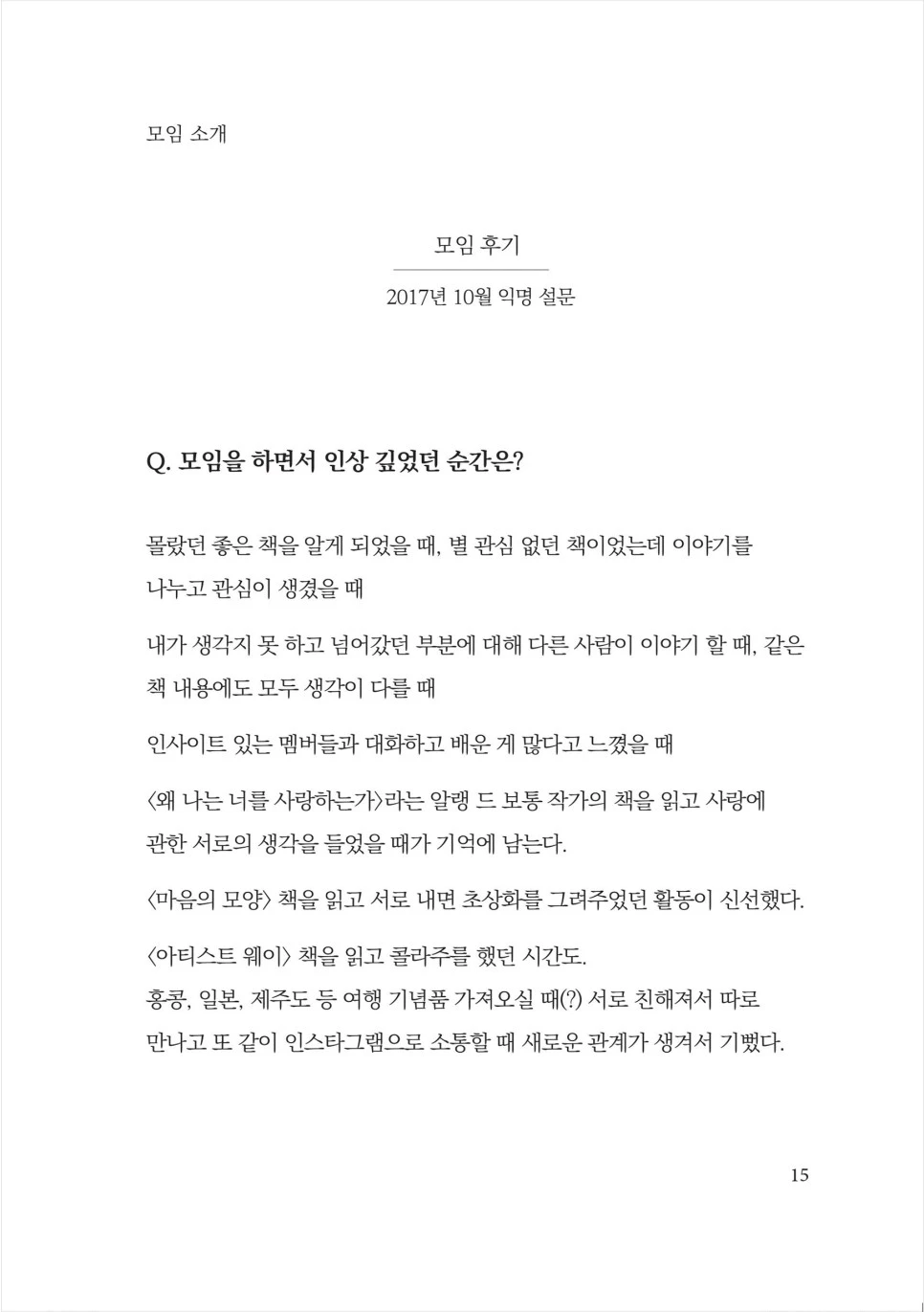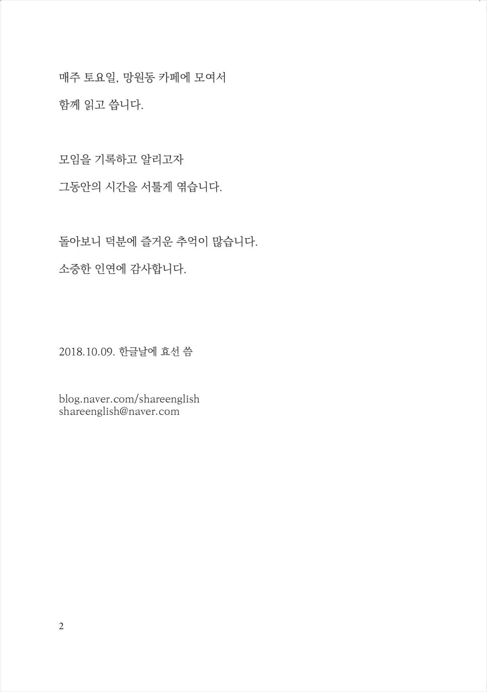 혼자 보기 아까워서 책 내용을 온라인으로 공개할까 합니다. 처음 만들어본 문집인 만큼 애착이 많이 가서요. 전문 디자이너님이 편집해주셨기 때문에 만족스럽습니다! pdf 파일로 올리고 싶지 않아서 사진으로 올리려고요. 1백 페이지여서 꽤 양이 있지만 5번 정도로 나누어서 해보겠습니다.