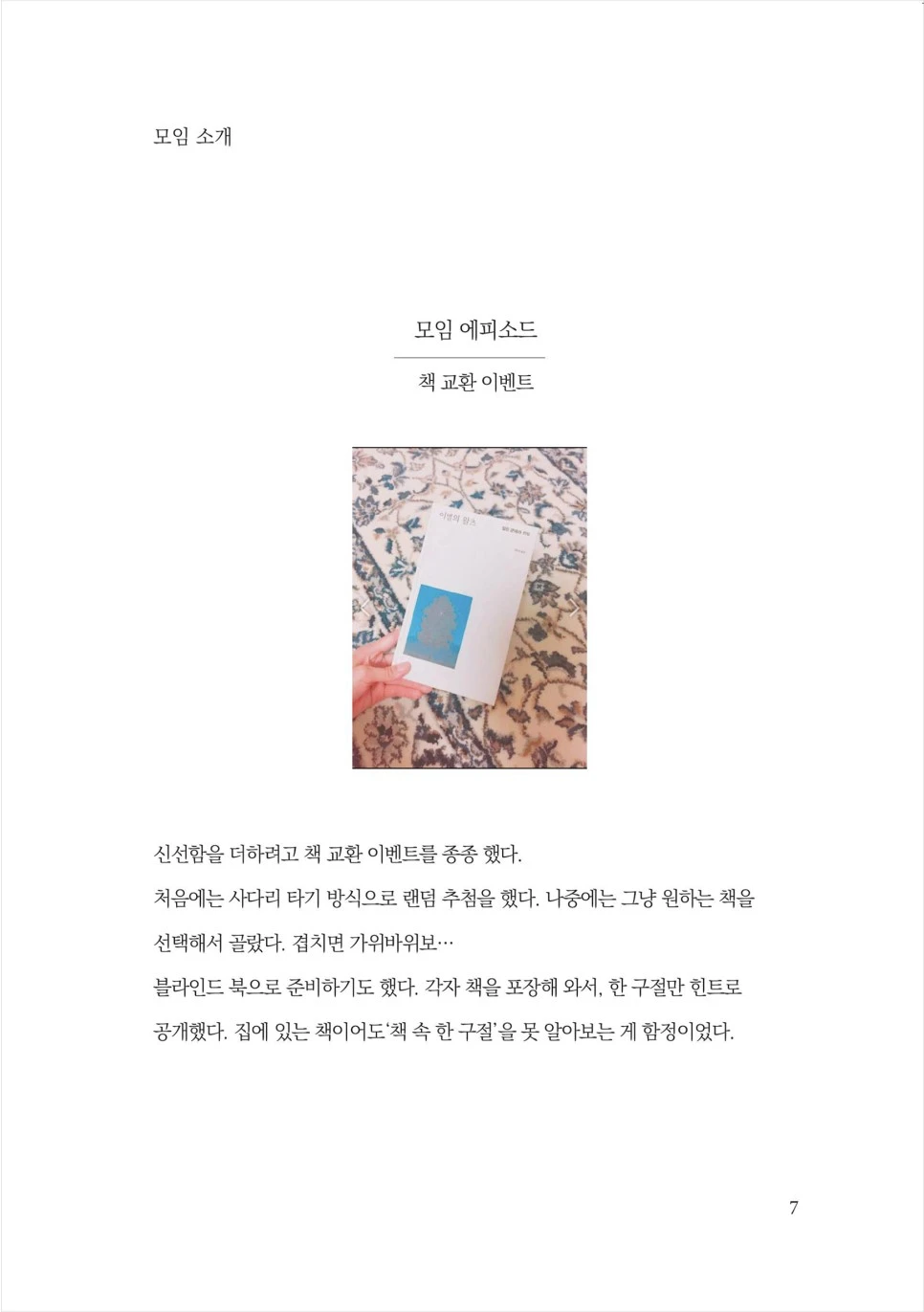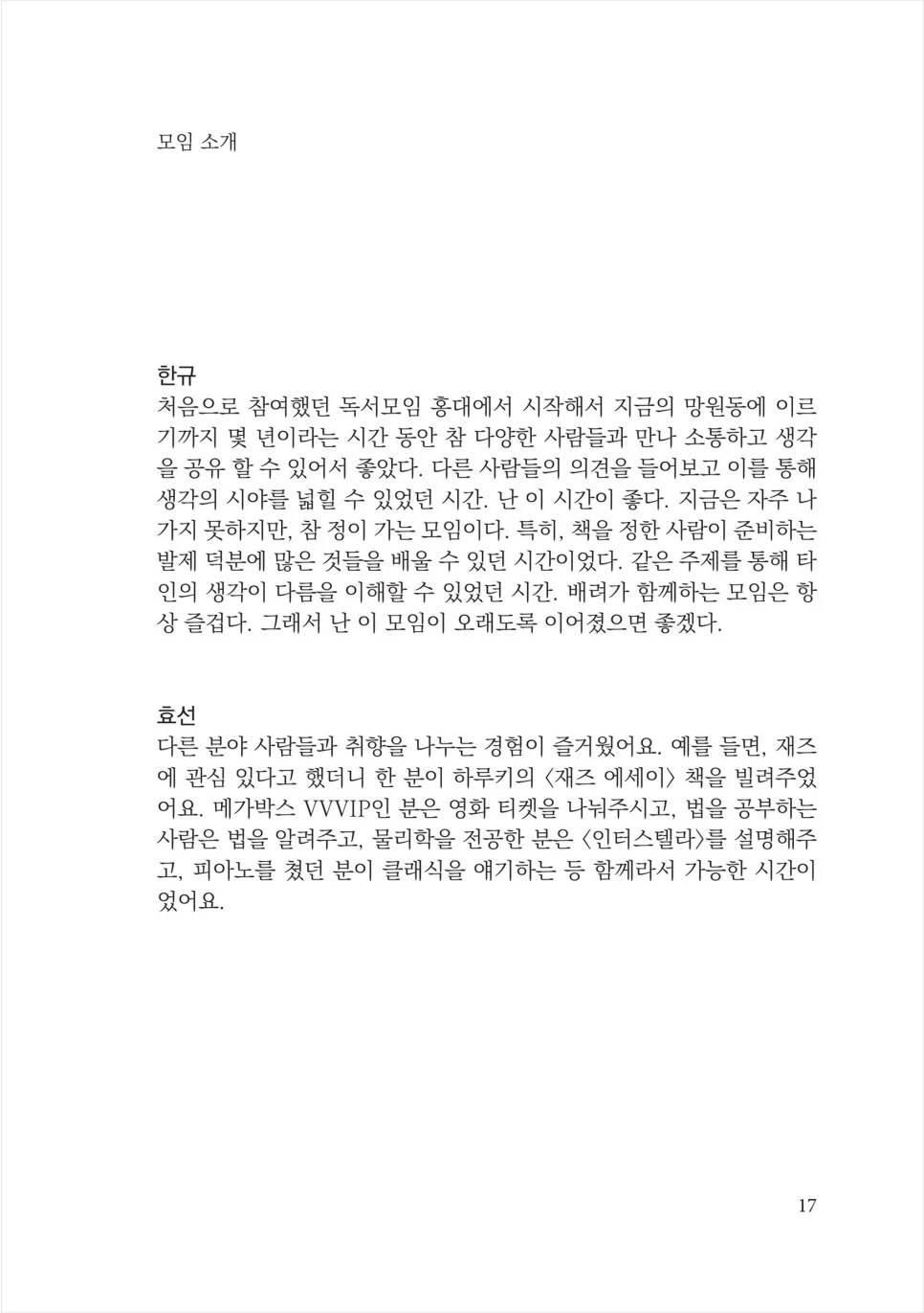 글 쓴 구성원 10명이 2권씩 가지면 10권이 남아요. 글을 쓰지 않았지만 모임에 가끔 참여하는 분들이 8-9명 정도 있어서 1권씩 드리고 나면 남지 않겠습니다. 모임 홍보 목적으로 망원동 독립서점에 비매품으로 비치 문의를 드릴까 했는데 1,2권이 남을지 모르겠네요. (한 줄 요약: 나눌 책이 없음)