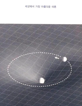 태양은 자신의 주변 공간을 굴절시키고, 지구는 신비로운 힘에 이끌려서가 아니라 기울어진 공간 속에서 직선으로 주행하기 때문에 태양의 주위를 돕니다. 이해가 잘 안 되면 깔때기 속에서 작은 구슬이 구르는 모습을 상상해보세요. 구슬이 구르는 것은 깔때기의 가운데 부분에서 신비한 '힘'이 나와서가 아니라 깔때기 벽면이 곡선이기 때문입니다. 행성들이 태양의 주위를 돌고 물체가 바닥으로 떨어지는 것도 공간이 곡선을 이루고 있어서입니다. /p.16-19