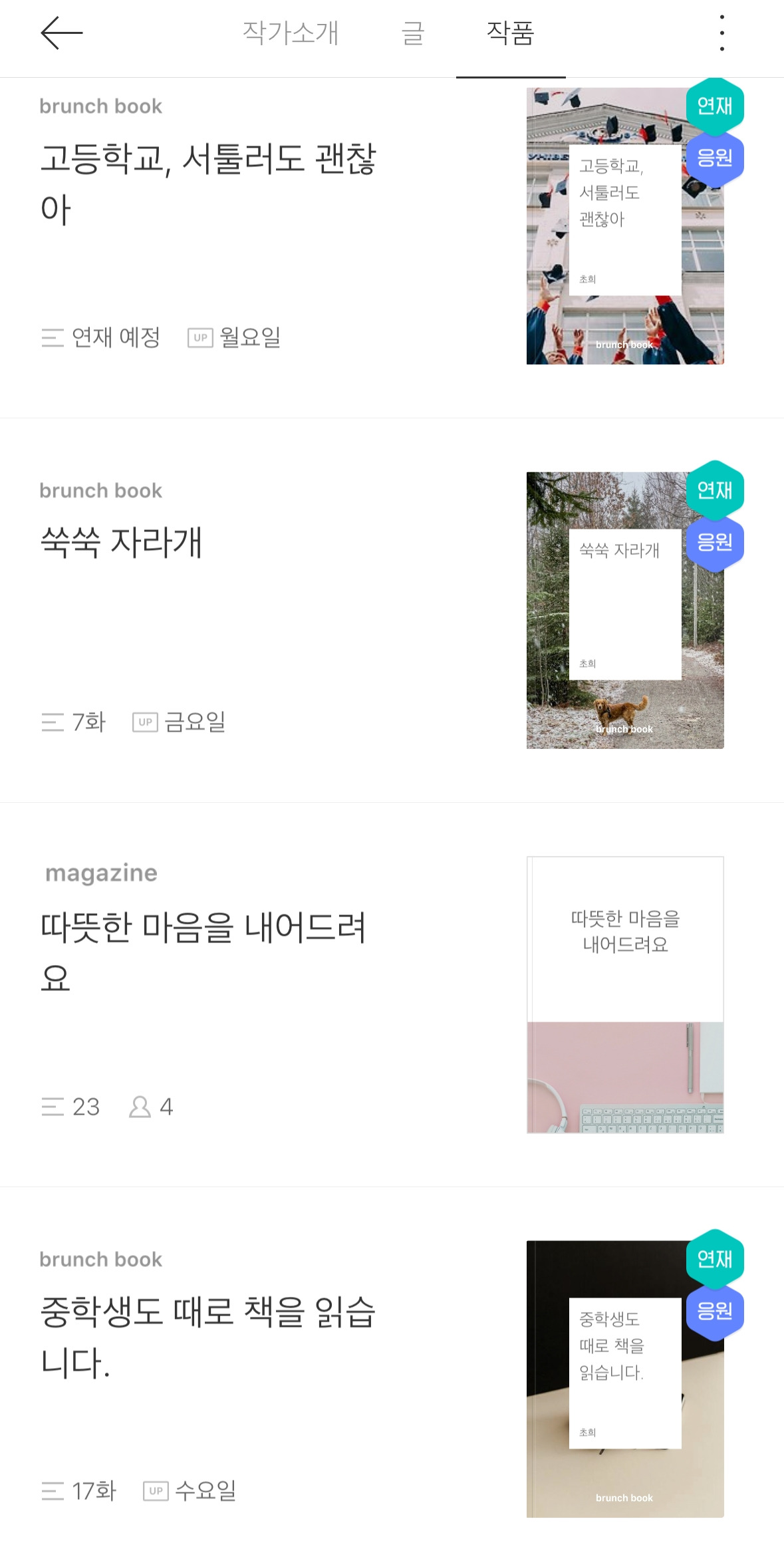 브런치 작가가 된 직후 작업에 들어간 <중학생도 때로 글을 읽습니다>는 나와의 격렬한 싸움 끝에 올해 3월까지 매주 놓치지 않고 연재를 이끌어 17화까지 달려왔다. 뛰어난 작가들에게는 17화쯤이야 아무것도 아닌 일이겠지만 의욕만 가득한 프로 습작러에게 매주 돌아오는 마감일은 실로 나와의 싸움이었다. 때로 마감일과 중요한 업무가 겹치는 날에는 밤 11시 50분이 넘어서야 허벅지를 찔러가며 글을 발행했고 때로 글이 유독 써지지 않는 날이면 컴퓨터를 끌어안고 울고 불고 짜증을 부리다가 성에 차지 않는 글을 냅다 발행하고는 부끄러운 마음에 홍당무가 되어 버린 날들도 있다. 잠이 오지 않는 하얀 밤이 찾아오면 브런치북 가득 담겨 있는 현실의 나답지 않은 형이상적이고 화려한 문구가 떠올라 이불을 차올린 적은 얼마나 많았는지, 애정하는 이불에 무릎 자국이 남을 지경이다.