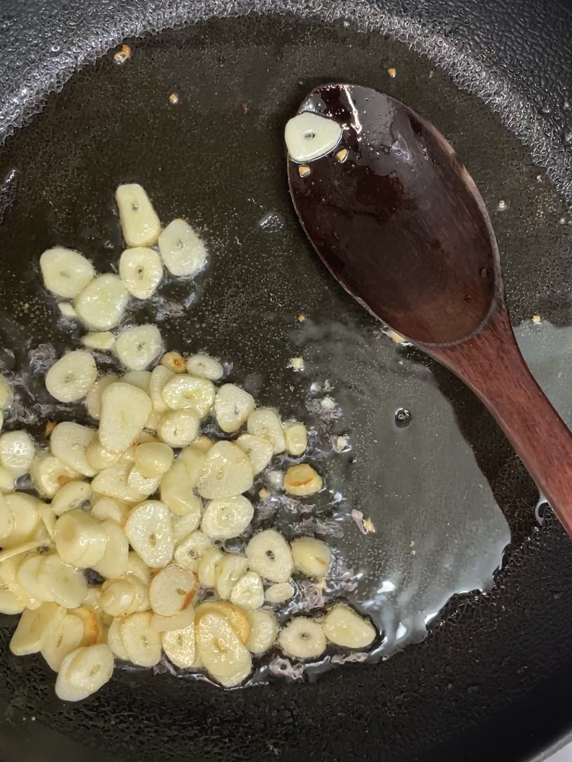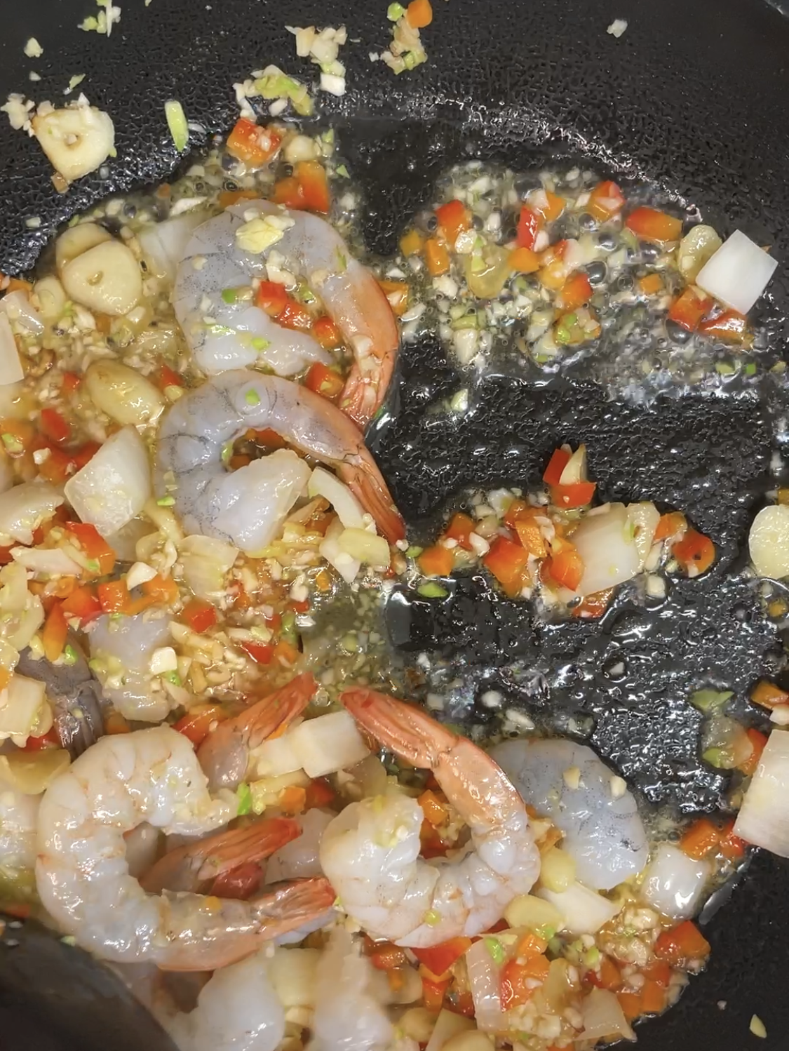 마늘을 팬에 볶아 기름을 내주고 잘라놓은 야채와 새우를 볶는다. 새우를 볶을 때 미림을 넣어주면 잡내를 잡을 수 있다.