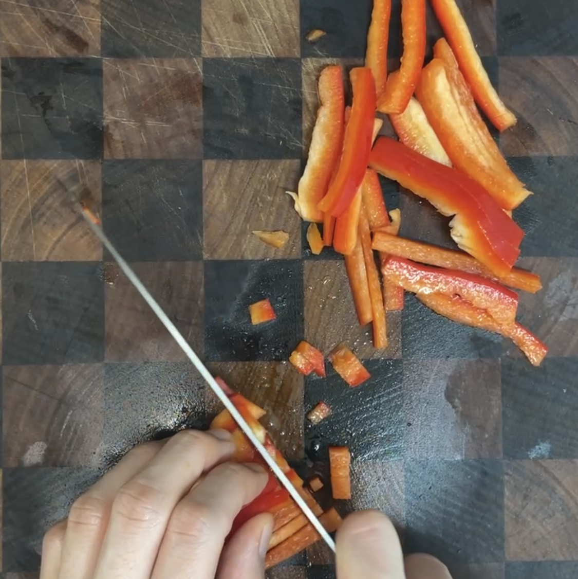 먼저 야채를 손질해 준다. 마늘, 양파, 대파, 버섯 등 보통 볶음밥에 넣을 야채는 가리지 않지만 이 볶음밥은 다른 건 몰라도 파프리카는 넣어주도록 하자. 빨갛고 노란 파프리카의 색감과 맛이 그리운 식당맛이 나는데 큰 몫을 한다.