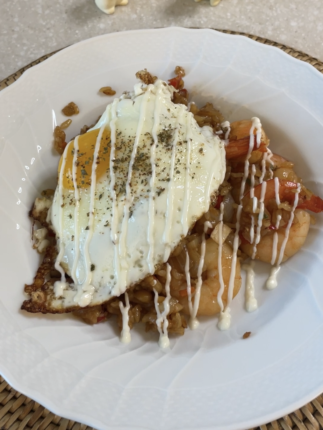 토핑으로 계란프라이를 올리고 마요네즈와 파슬리로 장식한다. 아무렇게나 먹던 시절의 나였다면 프라이팬째 먹었을 테지만 먹기 좋게 담기로 결심하였으니 최대한 예쁘게 먹어본다.