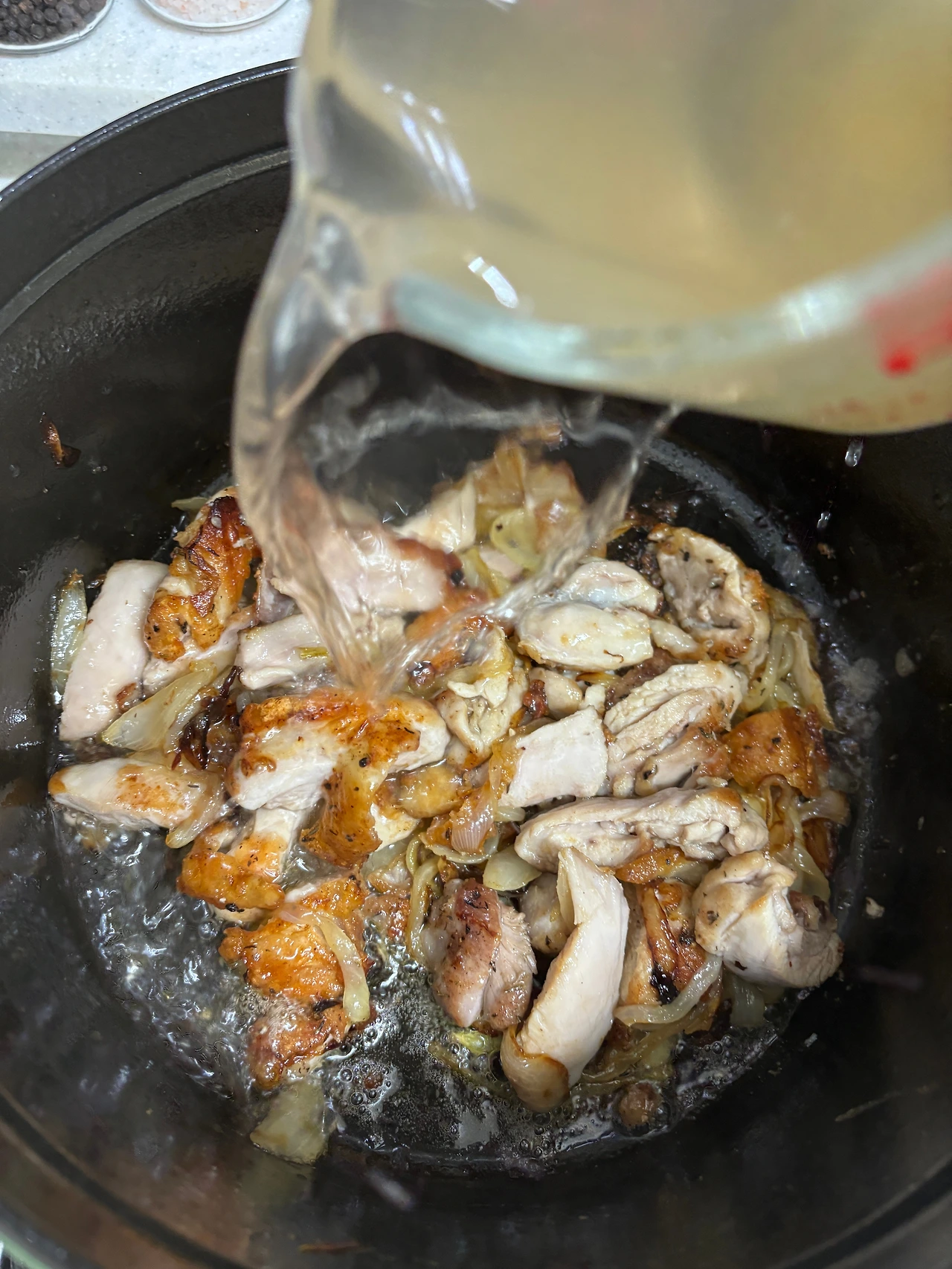 먼저 잘 달궈진 팬에 올리브오일과 버터로 채 썬 양파를 듬뿍 볶는다. 적당히 양파가 숨이 죽으면 덜어내고 밑간 한 닭다리살을 노릇하게 굽는다. 껍질과 반대면이 골든브라운의 먹음직스러운 색이 나오면 먹기 좋은 크기로 잘라준다.