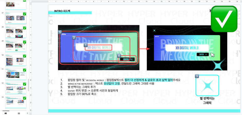하지만 영상 레퍼런스뿐만 아니라 영상 내 다양하게 적용된 XR 콘텐츠를 찾아보면서 어떤 것이 더 자연스러운지, 앞으로 지속적으로 다루게 될 3D 애니메이션 형태는 어떤 것이 있는지 더 주의 깊게 볼 수 있게 되었습니다. 이번 경험을 발판 삼아 다음 프로젝트에서 더 멋진 결과를 낼 수 있기를 바랍니다.