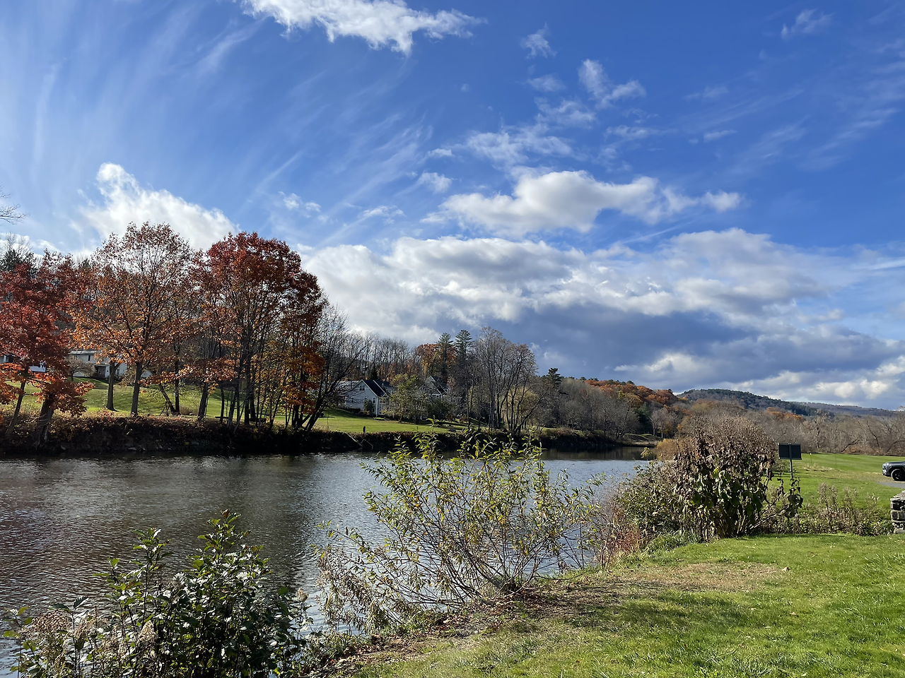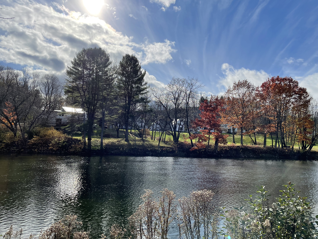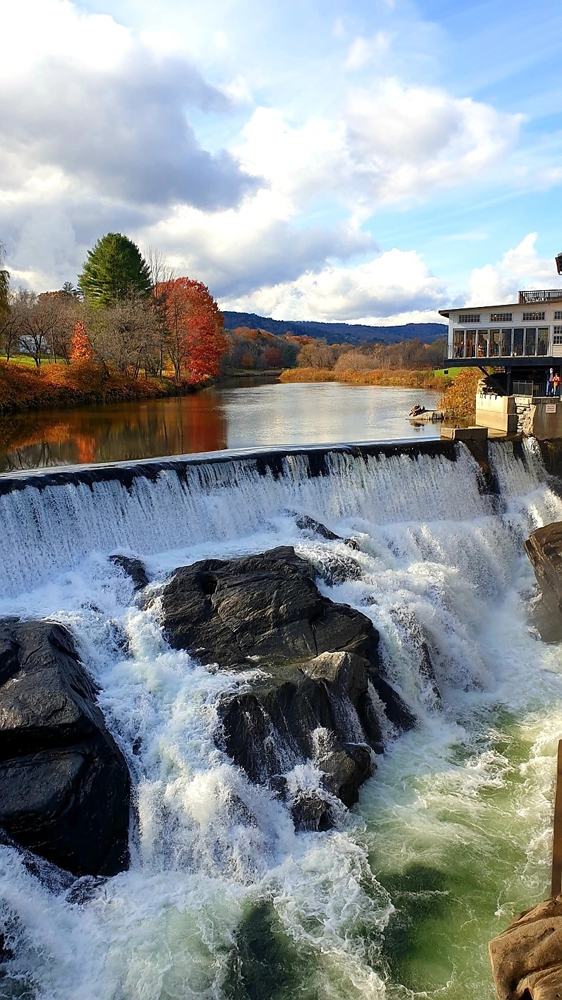 레스토랑 주변 경관이 또 장관이라 식후 산책 겸 한 바퀴 둘러보았다. 레스토랑 바로 옆에 목조 다리가 있는데, 이곳은 아우타퀴치 트래킹 코스의 시작점이다. 가을 단풍과 눈으로 덮인 겨울 산이 유명한 버몬트 주에서도 특히 유명한 곳이라고 하니, 나중에 코스를 한번 밟아봐야겠다고 생각했다. 목조 다리 아래로 유유히 강이 흐르고 강에서 떨어지는 작은 폭포도 운치가 있었다.