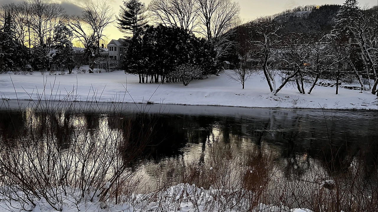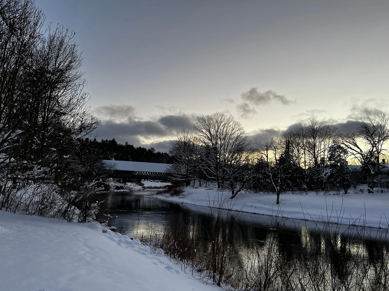 그리고 잠시 우드스탁 역사 센터 뒤편으로 흐르는 아우타퀴치 강을 구경했다. 얼음이 둥둥 떠내려가는 강물이 주변에 쌓인 눈과 앙상한 가지 위에 눈이 쌓인 나무와 어우러져 차가운 아름다움을 선사해준다. 강 위에는 국가 역사유적지 (National Register of Historic Places)로 등록된 지붕이 있는 링컨 다리 (Lincoln Covered Bridge)가 지나간다.