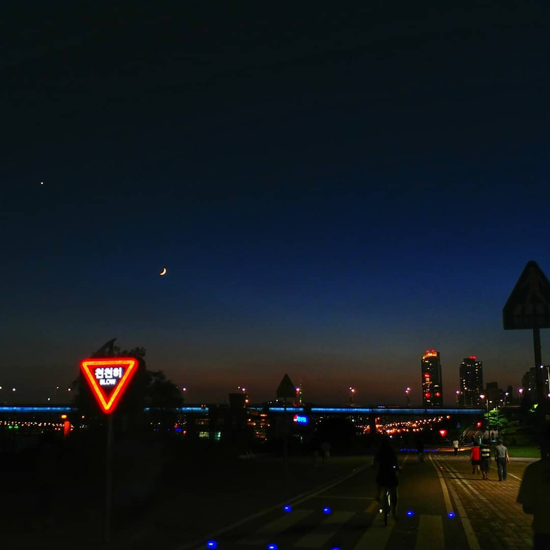 빨간색 테두리 안에 하얗게 빛나고 있는 '천천히'란 세 글자가 공중에 떠있다. 그 옆을 지나가는 자전거의 행렬을 멍하니 바라보며 다리 힘이 풀려 지쳐가는 사람을 위로해주기 위해 기다린다. 이제 그만큼 뛰었으니 지금부터 천천히 걸어도 된다는 무언의 위로가 내일을 향해 달리던 사람의 숨을 고르게 한다.