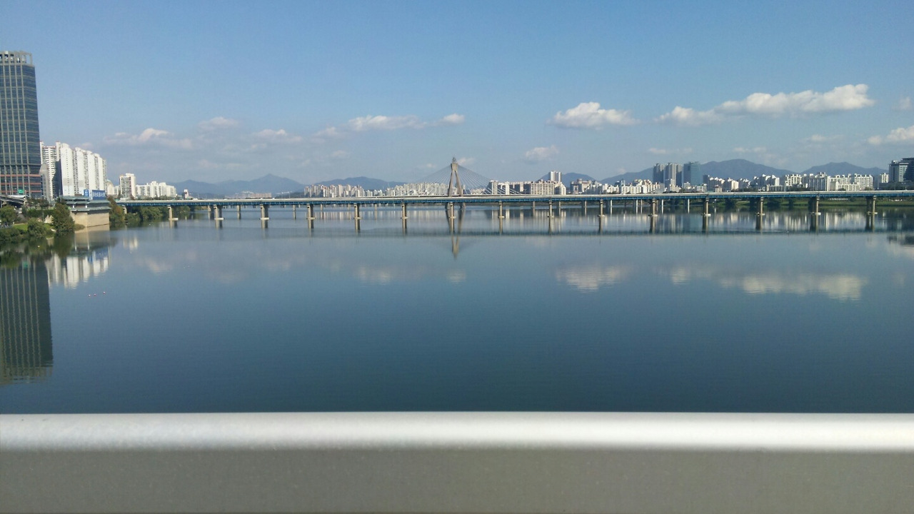 잠실대교 밑에서 잠시 휴식을 취하고 본격적으로 잠실대교를 건너기 시작했다. 잠실대교를 두발로 직접 건너는 건 색다른 경험이었다. 쌩쌩 달리는 차들과 정반대로 천천히 한강을 바라보며 건넜다. 잠실대교에서 내려다본 한강은 커다란 거울이었다. 과거 버스와 지하철을 타고 빠르게 무심히 지나가던 한강을 나만의 속도로 바라보니 한강의 크기와 아름다움에 감동을 받았다.