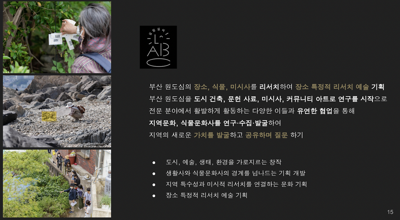 동네와 연결된 산을 오가며 사람과 장소의 이야기를 발굴하는데, 이때 주민들과 만나 대화하는 과정에서 주민들은 “내는 해줄 말이 없다. 전문가도 아닌데…. 내가 뭔 도움이 되겠나? 가난했을 때 내가 가진 기억이 무슨 필요가 있나?”라며 자신의 이야기를 사소하게 여기며 대답하기 어려워한다. 그러나 실험실 C에게 그들의 경험과 기억은 중요한 사료가 된다. 창파는 이 지역을 오가며 “눈을 감아도 선명하게 그려질 정도로 제2의 고향처럼 느껴지고 사랑하는 풍경”이라 말한다. 더욱이 실험실 C가 근대도시의 역사를 지닌 부산을 사랑하는 이유가 있다. “모든 길의 그 끝은 산으로 이어진다”라고 초량동 주민이 말한 바와 같이, 부산에서 자연과 도시의 경계가 뚜렷하다기보다 맞붙어있다. 부산 원도심은 한국 전쟁 당시 피난민들이 몰렸고, 70년대 판자촌 철거와 강제이주를 겪던 장소이며, 녹화사업을 통해 숲과 도시의 경계가 있는 것처럼 보일 뿐이다. 실험실 C는 산복도로가 지나는 부산의 골목길을 찾고 물길의 흔적을 찾아내는 작업을 계속하고 있다.