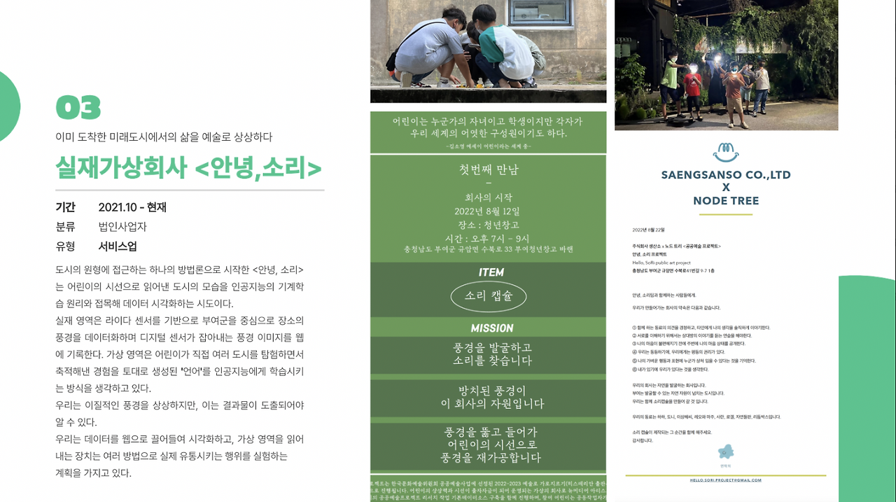 노드 트리는 부여 규암면에 지붕이 없는 단층집에 쓰레기가 가득 찬 곳을 발견해 쓸 만한 공간으로 바꾸면서 5년간 무상임대를 하는 중이다. 이 공간은 ‘생산소’라 불리며 오고 가는 사람들과 함께 쓰레기를 치우고 지붕을 얻고 새로운 곳으로 탈바꿈해서 여러 형태로 쓰이고 있다. 실제로 생산소는 예술가와 지역주민, 아이, 동식물 등 다양한 층위를 연결하는 데 중요한 역할을 한다. 또한 부여에서의 활동 영역을 넓혀가고 있는 들판에게 부여는 ‘미래도시’이다. 들판이 생각하는 미래도시는 ‘사람들과의 네트워크망으로 이뤄진 세계’이기 때문이다. 최근에는 이미 도착한 미래도시에서의 삶을 예술로 상상하는 작업을 시도하고 있다. 가상회사 ‘안녕, 소리’는 아이들의 시선으로 읽어낸 도시의 모습을 미디어 감각으로 연결해 그 너머의 세계가 무엇인지를 상상하는 작업이다. 이 작업에서 아이들은 직접 여러 도시를 탐험하며 축적한 경험을 토대로 생성된 언어를 만들어내고 있다.