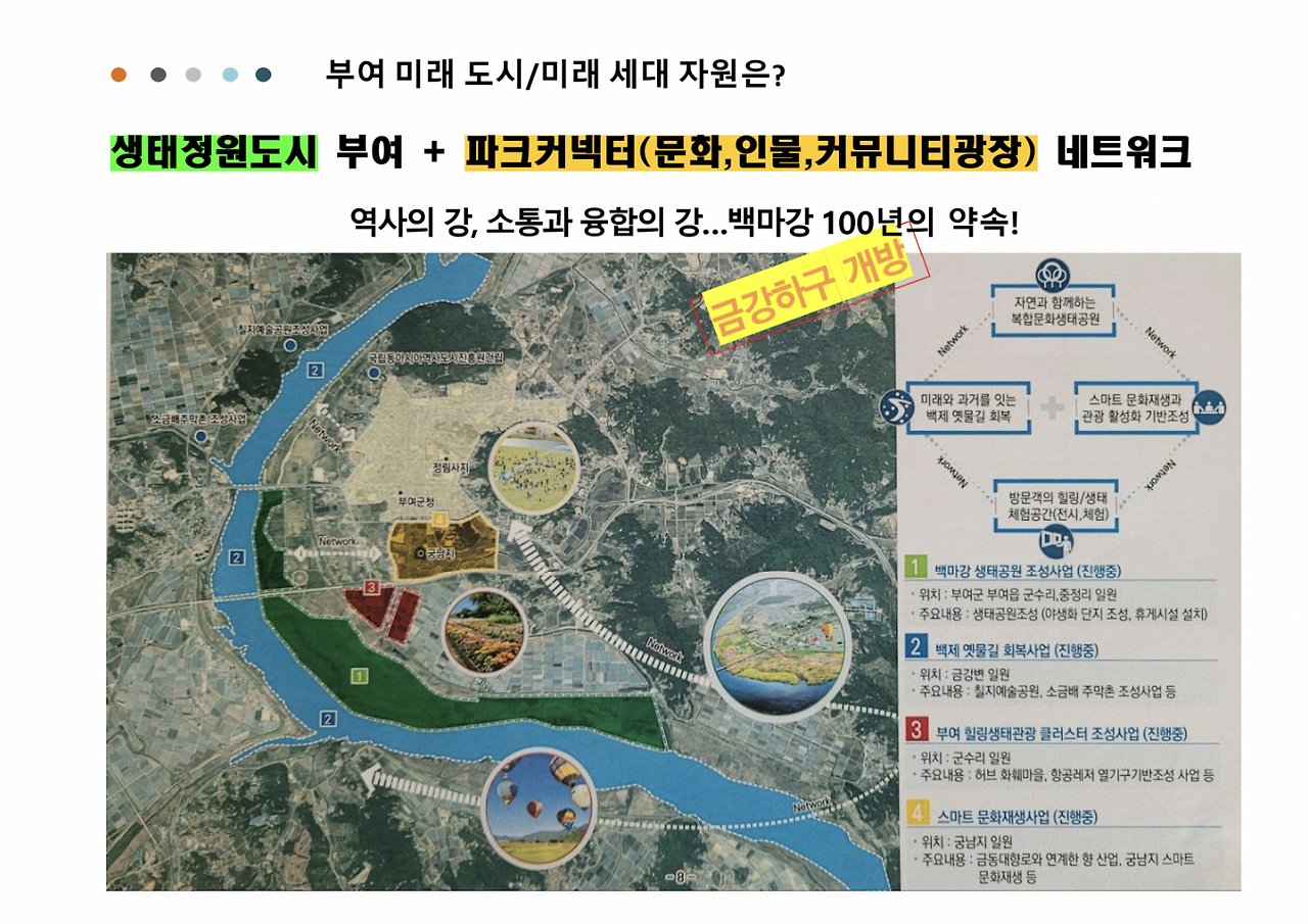 “백마강 국가공원 관련해서 덧붙여서 말씀드리고 싶은 부분이 있습니다. 국가정원은 수목법에 의한 것이며 실제 국가정원이 지향하는 방향이나 목적이 정원이라는 단어가 내포하고 있는 것과는 안 어울려요. 아직 마땅한 말이 없다 보니 정원이라고 쓰고 있어요. 그러나 국가정원은 일반 가정집 정원과는 다르다는 거예요. 단어의 오해로 인해 국가정원을 오해하는 거예요. 순천만과 태화강에서도 그런 일이 일어났어요. 백마강 국가정원은 금강 생태계 복원과 보호 차원인데, 여전히 주변 지역들과 갈등이 있어요. 왜냐하면 위에서 썩은 물이 계속 내려오고 있고, 하구도 열려야 하는데 광역 단위와도 해결해야 할 문제예요. 그래서 부여가 맡은 역할은 생태복원과 미래도시의 문을 여는 것이고, 백마강을 살리겠다는 꿈은 금강을 살리는 것이에요. 생태를 중요시하는 미래도시로서 부여가 앞장서고 있죠.”