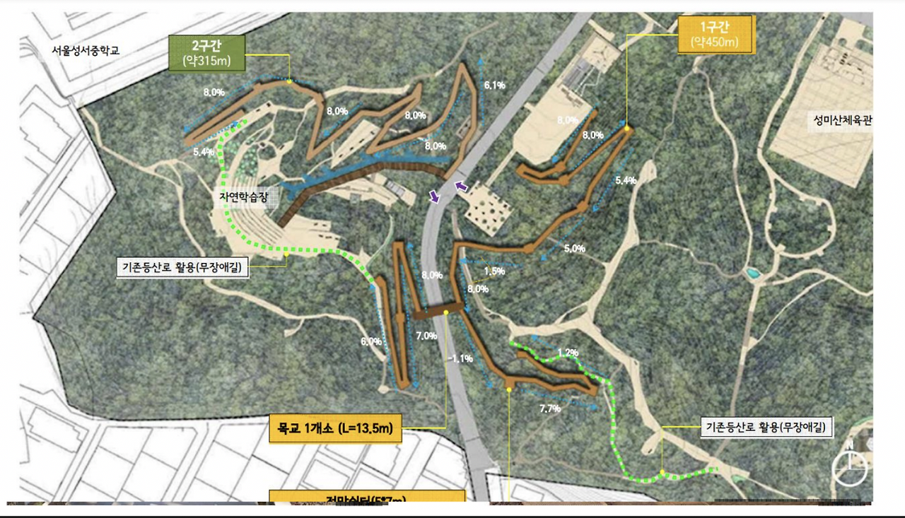 최근에는 성산근린공원으로서 무장애 숲길을 조성하는 계획이 있다. 누구나 걷기 좋은 숲길을 만들기 위해 데크를 설치한다는 것이다. 당시 걷기 편한 숲길로 조성하기 위한 설문조사를 실시하였는데, 설문조사 내용에는 성미산을 찾는 이유나 산책로의 개선사항에 대한 질문뿐 어떤 길로 만들겠다는 계획에 대한 설명은 없었다고 한다. 모모의 발표에 따르면, 데크 길을 만든다는 문장에 여러 의미가 내포하는데, 유아차와 휠체어를 타고 자연스럽게 올라가기 위한 경사 8도 정도의 지그재그 길을 많이 내야 하며, 나무를 얼마나 깎아내는지 면적에 대한 설명은 없었다는 것이다. 이러한 문제제기를 하면, 일각에서는 장애인 인권에 대해 반대하는 것이냐고 반문한다. 그러나 휠체어로 성미산으로의 진입조차 어려운 상황에서 데크 길 설치는 오히려 빛 좋은 개살구일지도 모른다. 나무가 약 50년을 자라면서 그 나무를 기준으로 생태계가 형성되기 때문에 성미산에는 희귀한 새들이 많이 살고 있다. 그런데 성미산을 관리하려는 사람들의 입장은 오래된 아까시나무를 베어야 한다는 주장과 공원을 밝게 유지해야 한다는 치안의 문제를 강조한다. 그러나 모모는 너무 밝은 빛으로 인한 빛 공해 문제를 지적한다.