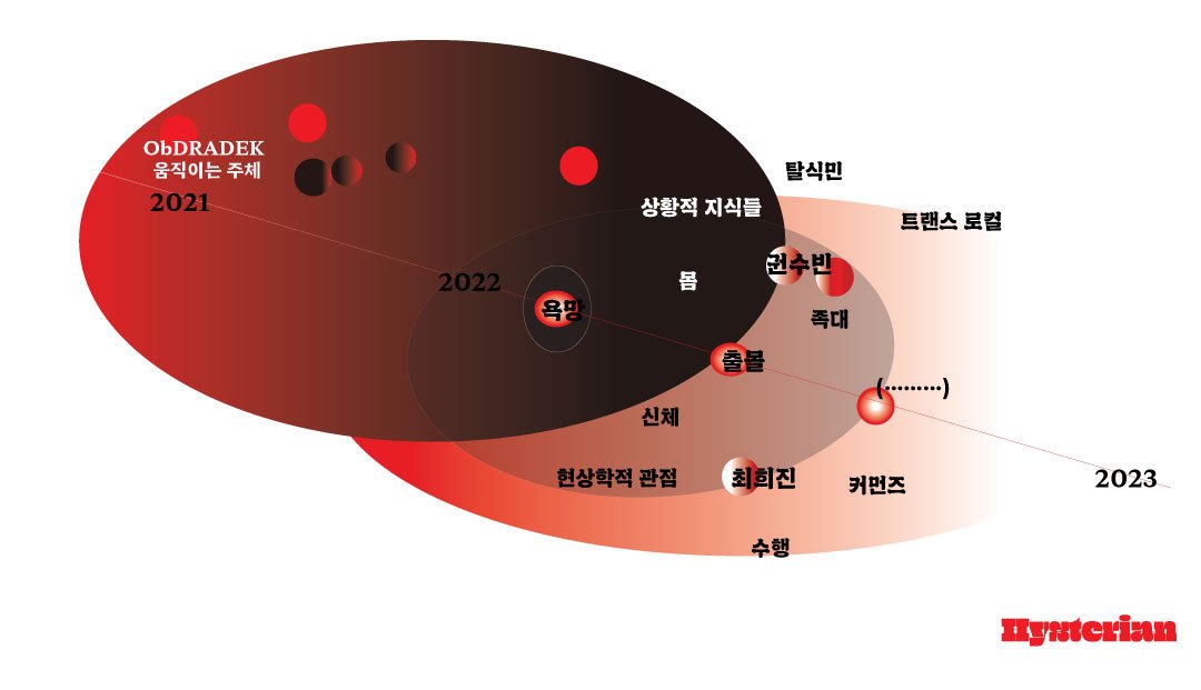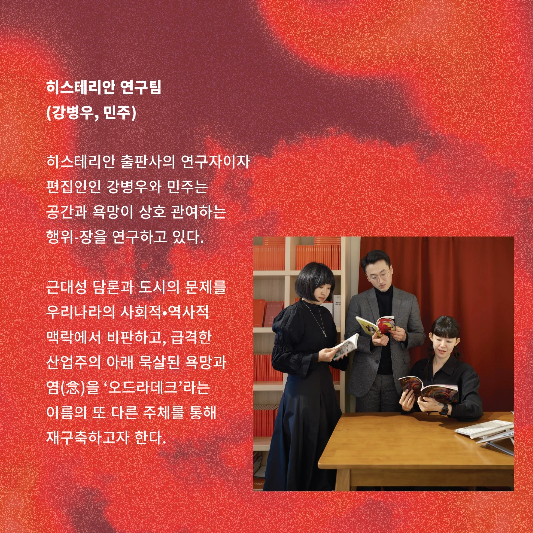 히스테리안은 대안적 삶과 예술의 관계성을 연구하고 텍스트를 쌓는 작업을 하고 있습니다. 2021년부터 시작된 히스테리안의 연구 프로젝트, 전시 ‘오드라데크’는 해를 거쳐 올겨울 종장에 다다를 예정입니다. 삼 년간 축적한 자료와 다양한 방식으로 재해석한 개념들이 서로 교차하는 이 여정에는 외부의 관심 어린 눈에 자못 명확히 전달되지 않는 부분도 있었습니다. 출판과 전시를 준비하는 과정에서 이렇게 연구 맥락이 투명하게 파악되지 않는 부분이 생길 때마다 아쉬웠습니다.