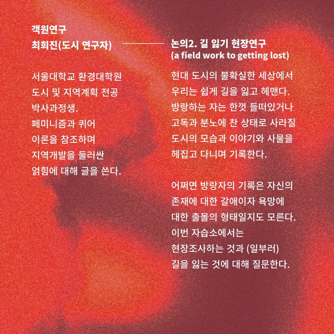 연구자 최희진은 현장을 조사하다가 (일부러) 길을 잃습니다. 길을 잃어버리는 일은 단순히 길 찾기에 실패했음을 의미하는 게 아닙니다. 모든 것을 운에 맡기겠다는 무책임하거나 순진한 시도도 아닙니다. 그는 작가 리베카 솔닛(Rebecca Solnit, 1961-현재)의 말을 빌려, 길 잃기란 더 커진 세상에 당도하는 하나의 방법론임을 강조합니다.