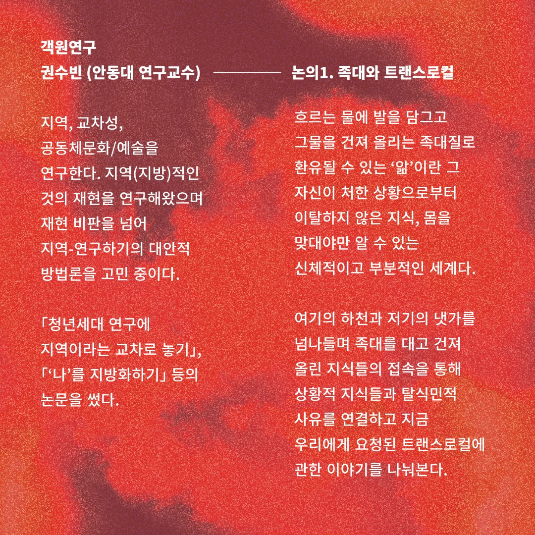 족대질로 환유될 수 있는 앎이란 어떤 것인가? 족대질로 건져 올린 것은 해석되기를 기다리는 날 것의 현장에만 불과한 것이 아니다. 자신의 역할이 기획, 연구, 관찰, 기록, 디자인 어느 것에 있든 우리는 자신만의 족대로 세계를 바라보기 때문이며 그것 자체가 앎의 행위다. — 권수빈 | 족대와 트랜스로컬 ‘1. 족대와 상황적 지식들’ 중에서