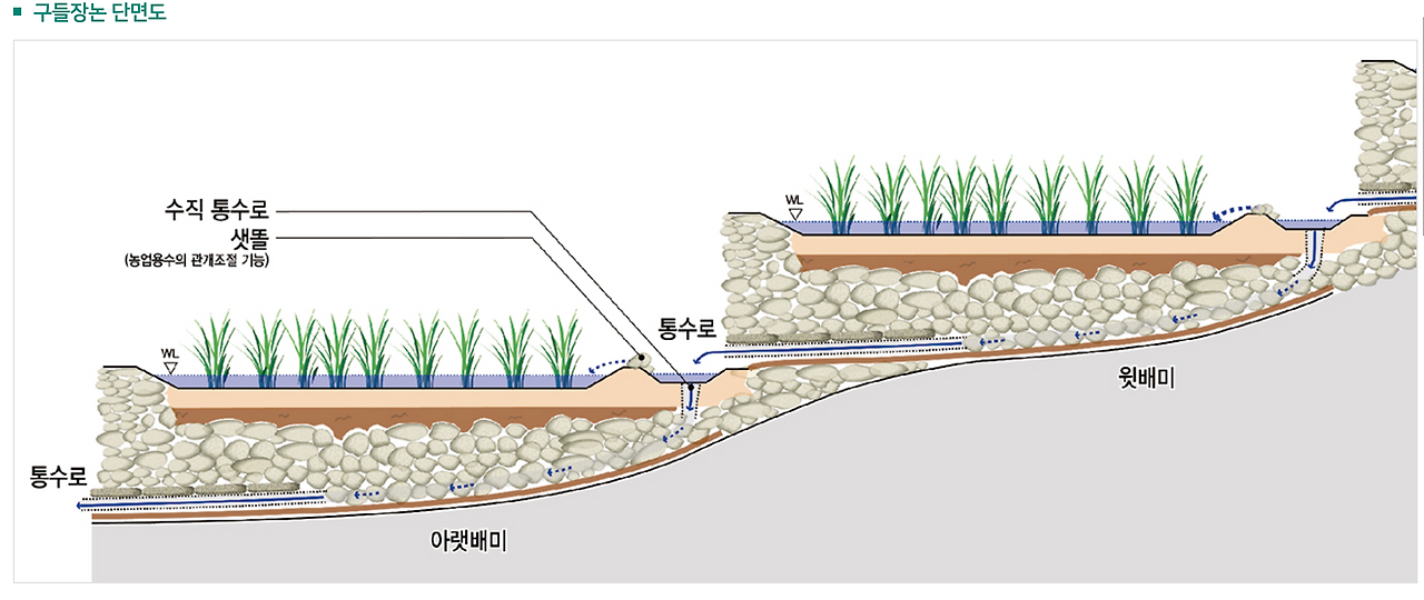리서치트립에서 여러 지역을 오가면서 특히 지역 내 하구둑, 보, 댐, 저수지의 역할은 장마의 폭우로 인한 범람의 피해를 줄이기 위함도 있지만 농업용수를 확보하기 위함이 크다는 점을 알게 됐다. 그만큼 농사에서 '물'은 중요하게 다뤄야 할 물성이다. 그렇기에 구들장논은 통수로를 만들어 상/하부 논을 나누어 물을 조달하는 형태인 '관개배수'로 진행된다는 점이 눈여겨봐야 할 점이다.