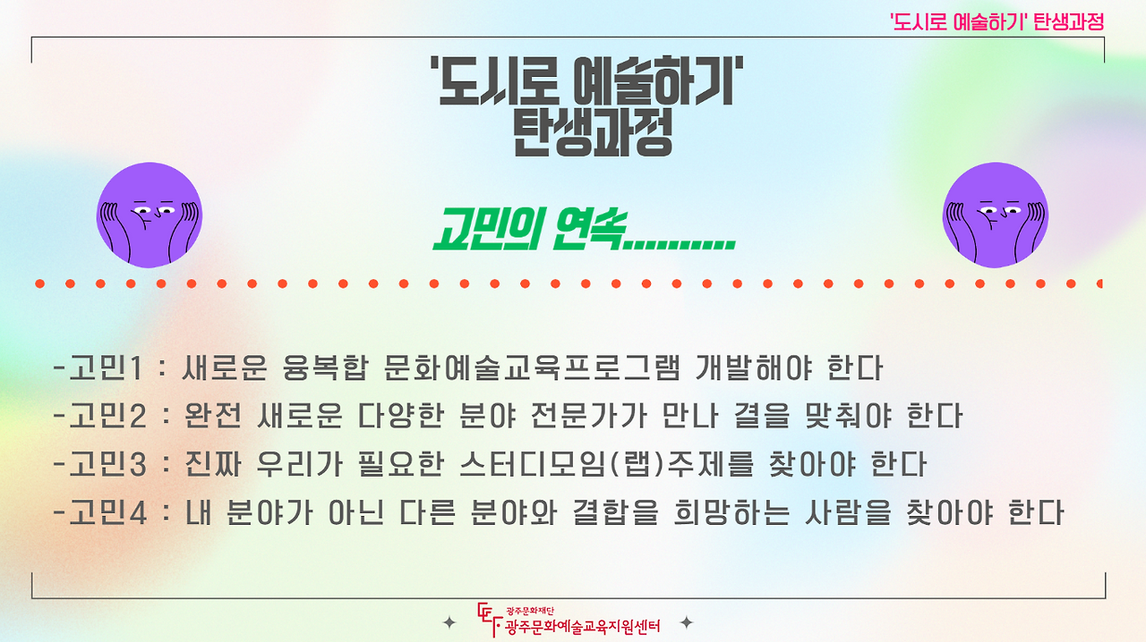 굳이백배미팀은 광주에서 진행한 창의예술교육랩 사업을 통해 아이디어 단계를 확장해갈 수 있었고 광주에서는 지역, 장르의 경계 없이 시도하는 사업을 진행하기 위한 적극적 변화를 모색했다. 흔히 ‘행정’이라고 부르는 공적자금이 투입되는 기관과 단체들이 변화를 두려워하는 보수적인 집단이라는 인식이 있지만, 이번 광주문화재단 담당자의 이야기에서 적극적 의지와 행동이 느껴졌다.