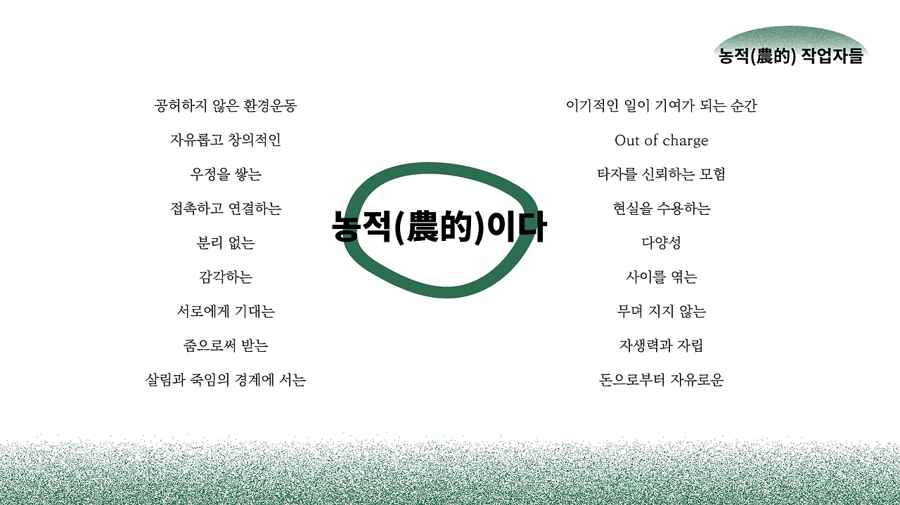 꼭 농사를 짓는 것이 아니어도 무언가를 함께 할 수 있는 장을 마련하고, 서로를 돌본다는 것이 농적인 작업이라고 생각해요.