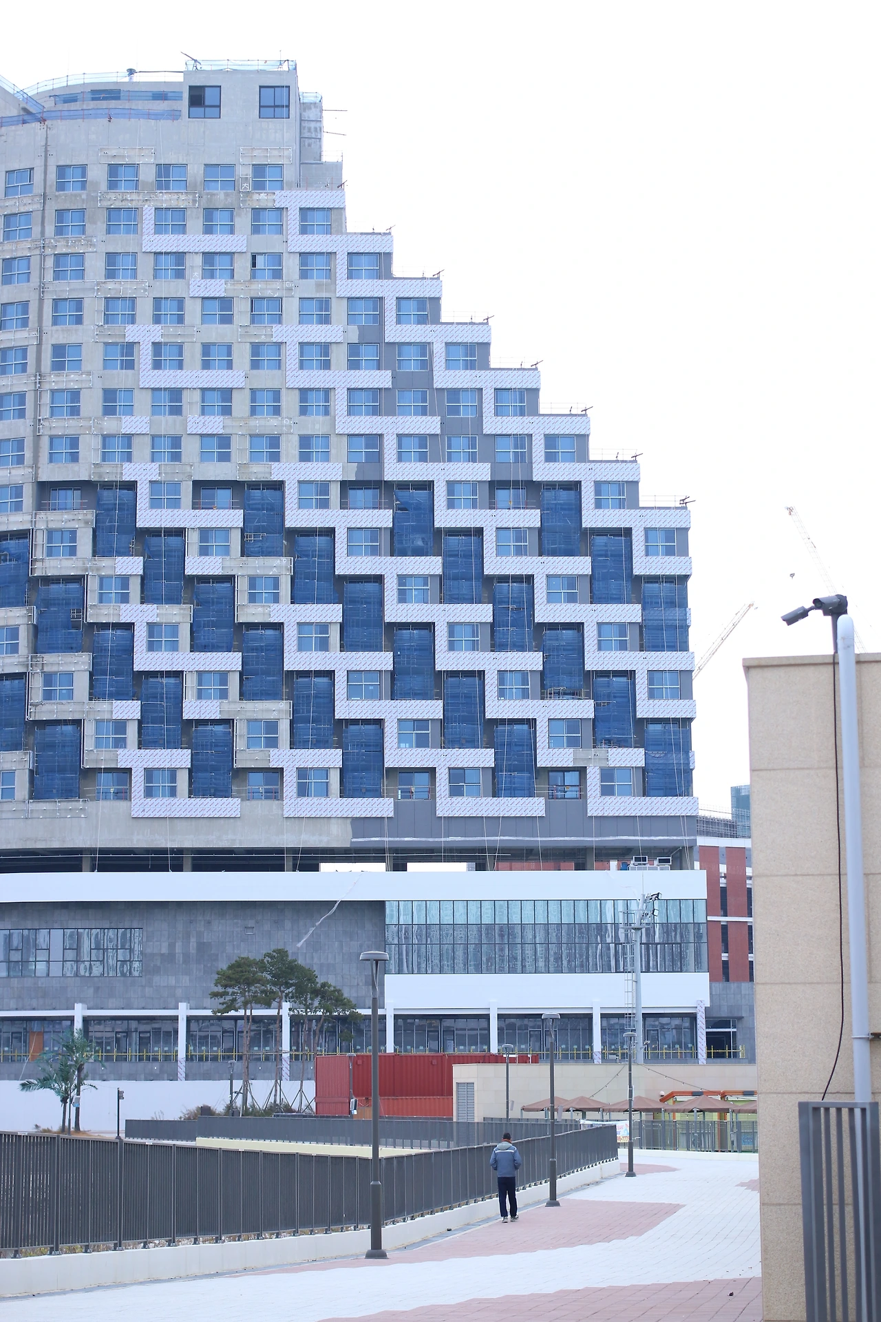 웨이브 파크 주변을 돌다 보면 아파트 단지로 연결되는 도로로 향해 걷게 됩니다. 아직 진행 중인 공사인만큼 곳곳의 여러 현장감이 묻어나는 자재들을 볼 수 있었고 빼곡하게 쌓아 올린 건물의 윤곽이 이국적으로 보였습니다. 바다였던 곳을 축적된 땅으로, 땅에 기둥을 박아 하늘로 뻗기를 반복하는 도심에서 세워지는 아파트는 길과 길을 연결하여 그 외의 곳을 바라볼 수 없게 시야를 가로막기도 합니다.