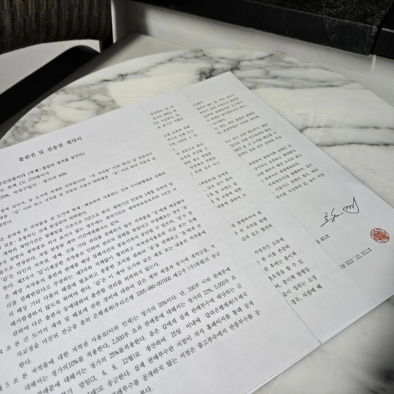그 모든 시간들이 이 한 장의 계약서 위에 담겨 있다. 아직 교정과 교열, 디자인 등 넘어야 할 산들이 많이 남아 있지만, 그 과정조차 설렘으로 다가온다. 내가 쓴 글이 책이라는 이름으로 세상에 나오는 날까지, 긴장감과 기대감이 뒤섞인 지금 이 순간마저 소중하게 느껴진다.