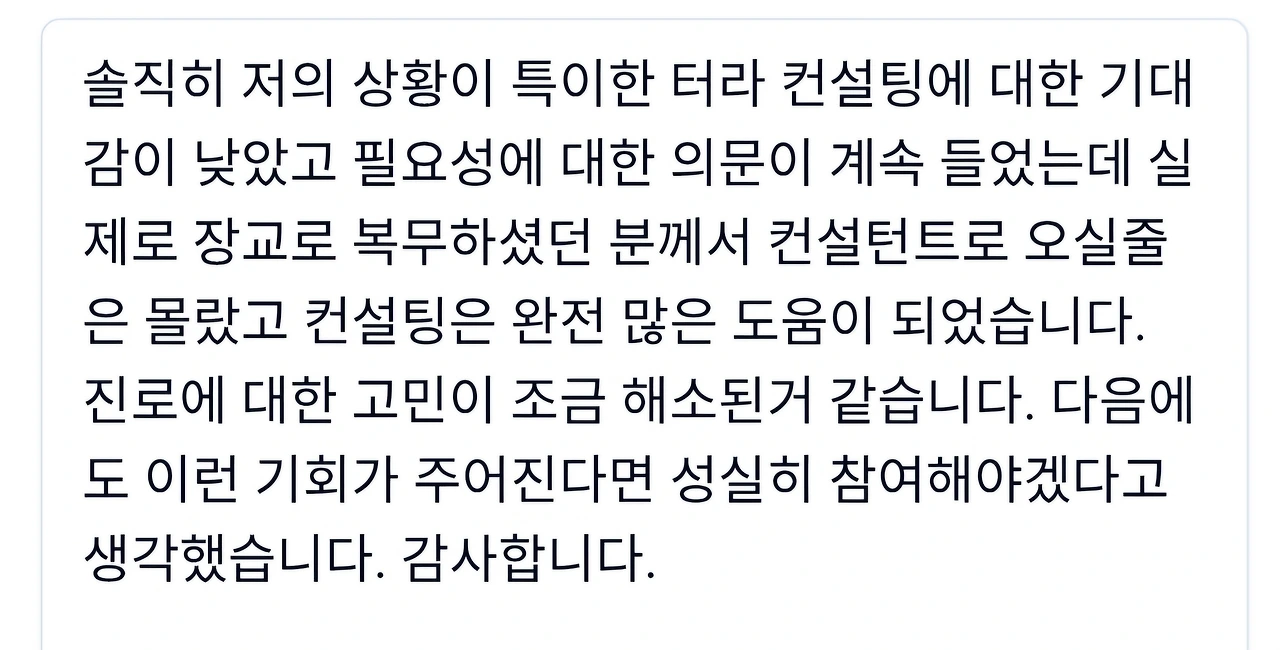 가끔 컨설팅이 끝난 뒤 감사의 메시지를 받을 때가 있다. “진로에 대한 고민이 조금 정리된 것 같다”는 말, “다음에도 이런 기회가 있다면 꼭 참여하고 싶다”는 짧은 문장 속에는 그동안 혼자 끌어안고 있던 불안이 조금은 내려놓아졌다는 안도감이 담겨 있다. 그럴 때 나는 이 일이 단순한 정보 전달이 아니라, 한 사람의 삶의 방향을 함께 점검하는 일이라는 사실을 다시 확인한다.