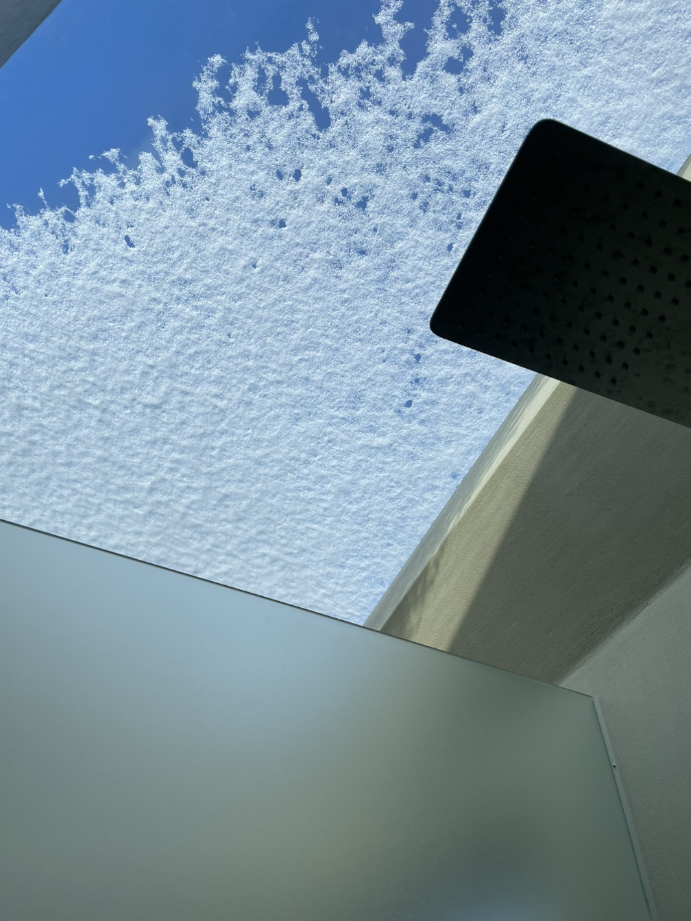 천장을 유리로 두어 파아란 하늘 아래서 샤워할 수 있어 기뻤고