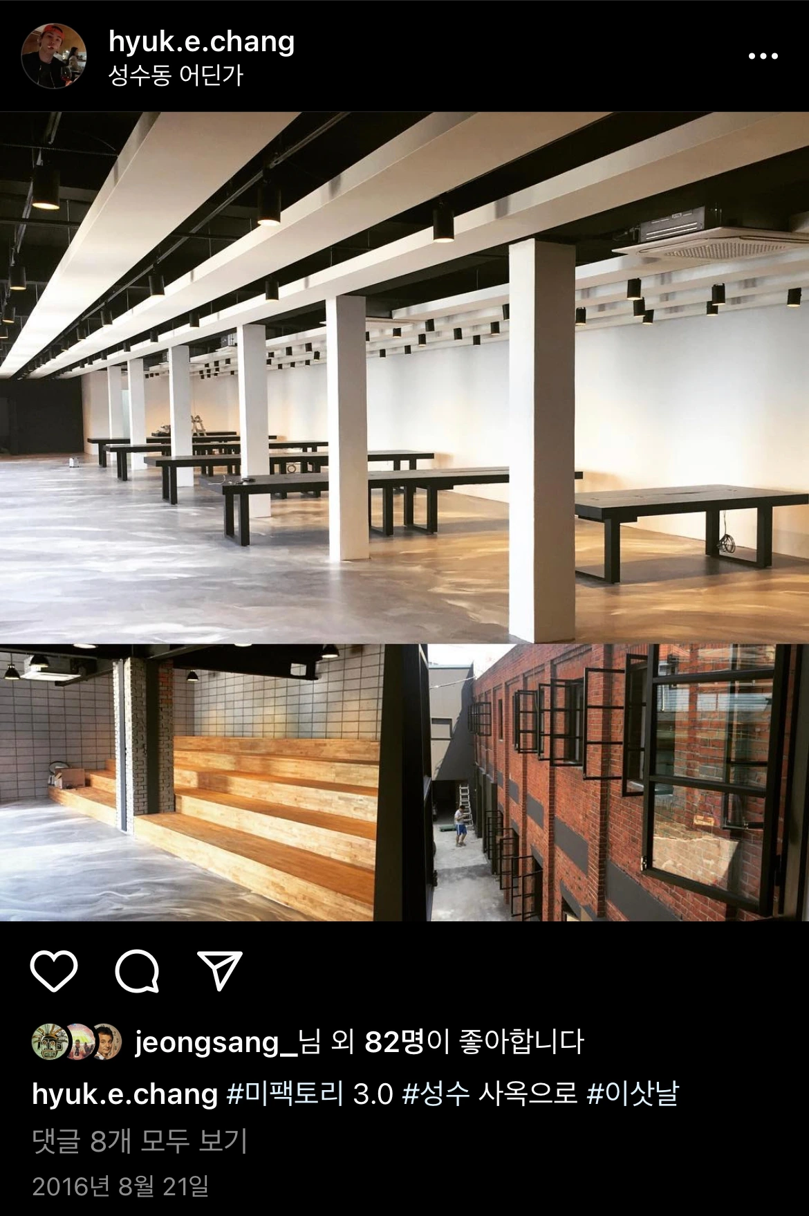그러는 와중에 당황스럽게도 함께하는 회사의 규모와 인원은 더 늘어나고 뱅뱅사거리에서 1년을 버티지 못하고 우리는 사무실을 또 옮겨야만 했다. 경영진들은 어디로 사무실을 옮겨야 하나를 고민하다가 지속적인 회사의 성장과 반복적인 사무실 이사에 지쳐 아예 큰 사무실로 가는 게 어떻겠냐는 얘기가 나왔다. 그럼에도 너무 딱딱한 회사 같지 않았으면 좋겠다는 생각에 모두가 동의했다. 그리고 모두가 예상하지 않는 곳에 사무실을 가져보자는 마음에 우리는 성수동을 선택했다.