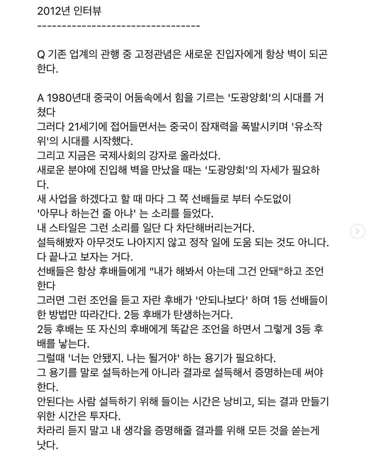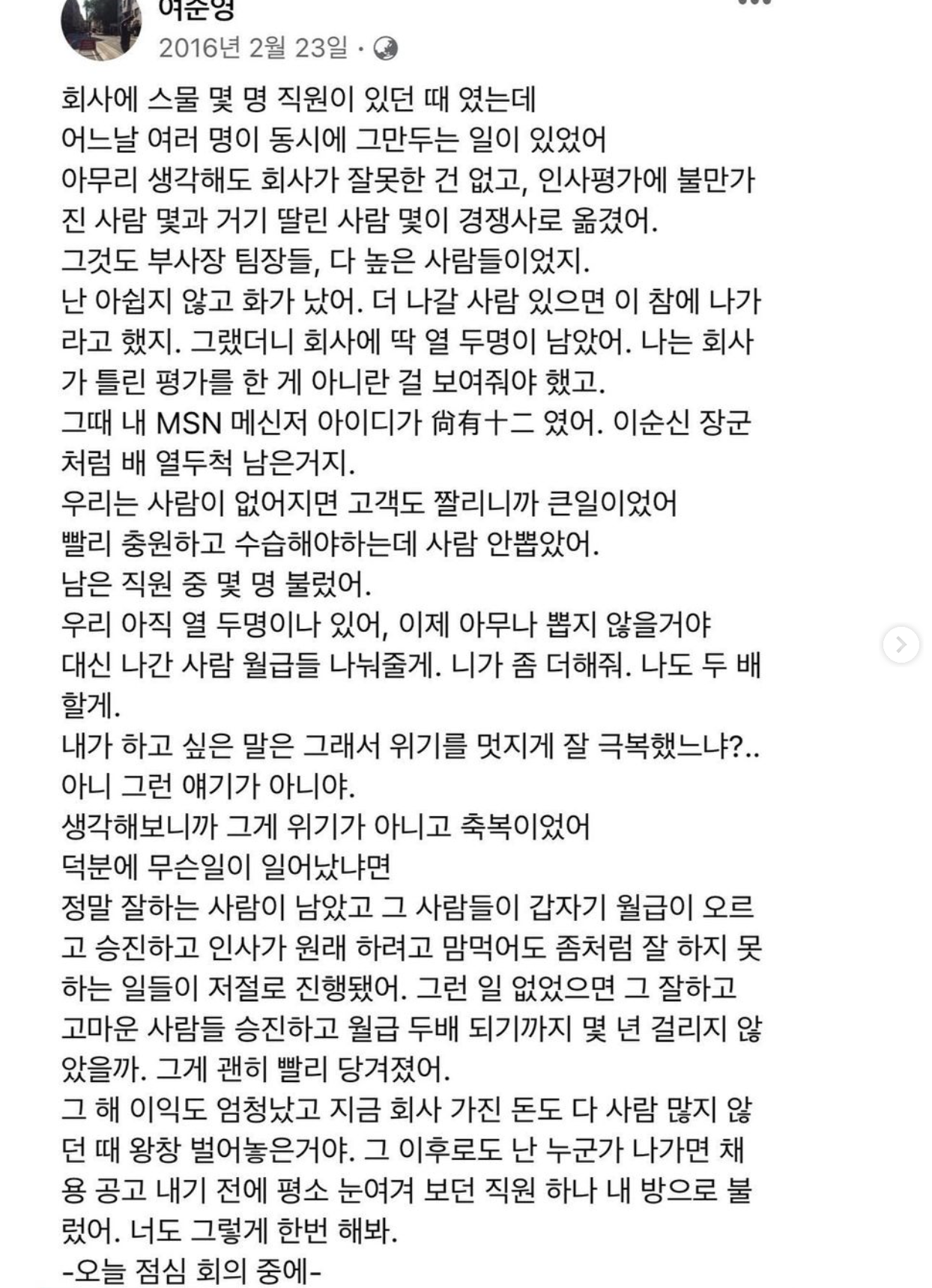 “누가 어딘가에서 나를 좋게 얘기하는 것, 수집은 어렵지만 가장 가치 있는 정보입니다. 저 역시 지금까지 저를 좋게 기억해주신 분들 덕에 여기까지 왔다고 생각합니다. 돈으로 따지면 이런 게 1조원짜리 가치라고 생각해요.”