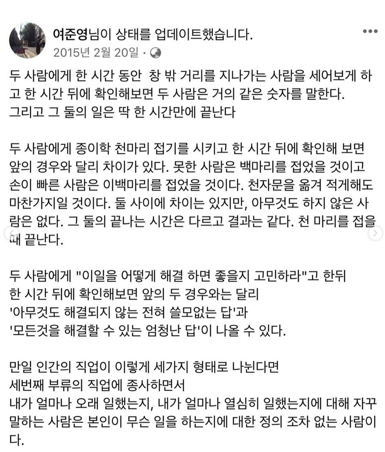 예를 들어서 제가 “에디터님이 정말 최고로 글을 잘쓴다” 라고 제 인스타에 올렸다고 쳐봐요. 근데 누군가 그걸 퍼갔고, 또 그걸 어느 잘나가는 스타트업 경영자가 본거죠. 마침 그회사에 자리가 비어 있는 브랜드 라이터로 스카우트해요 주식도 좀 주면서. 근데 그 회사가 대박이 나서 그 주식이 가치가 1조가 돼 버려요. 포스트 하나가 그렇게 커진거죠. 그럼 1조 중에 일부 저 주실거예요? 글 하나 올린거지만 저거 없었으면 1조가 아예 없는거잖아요. 극단적인 예지만 우리도 모르게 우리한테 저런 일은 늘 벌어지고 우린 그걸 기억해야해요. 작은 얘기라도 우리에 대해 좋게 얘기해주는 사람들을 찾아내 알아야해요. 저는 그러는 편이예요