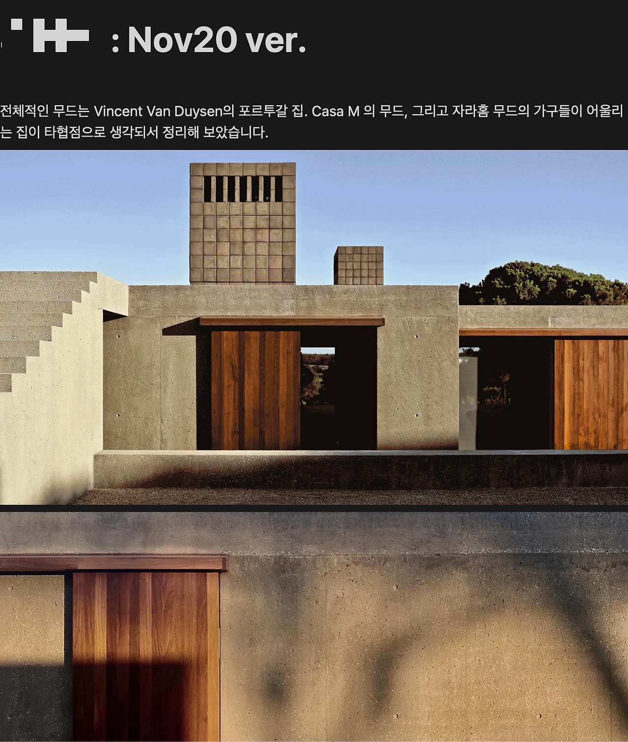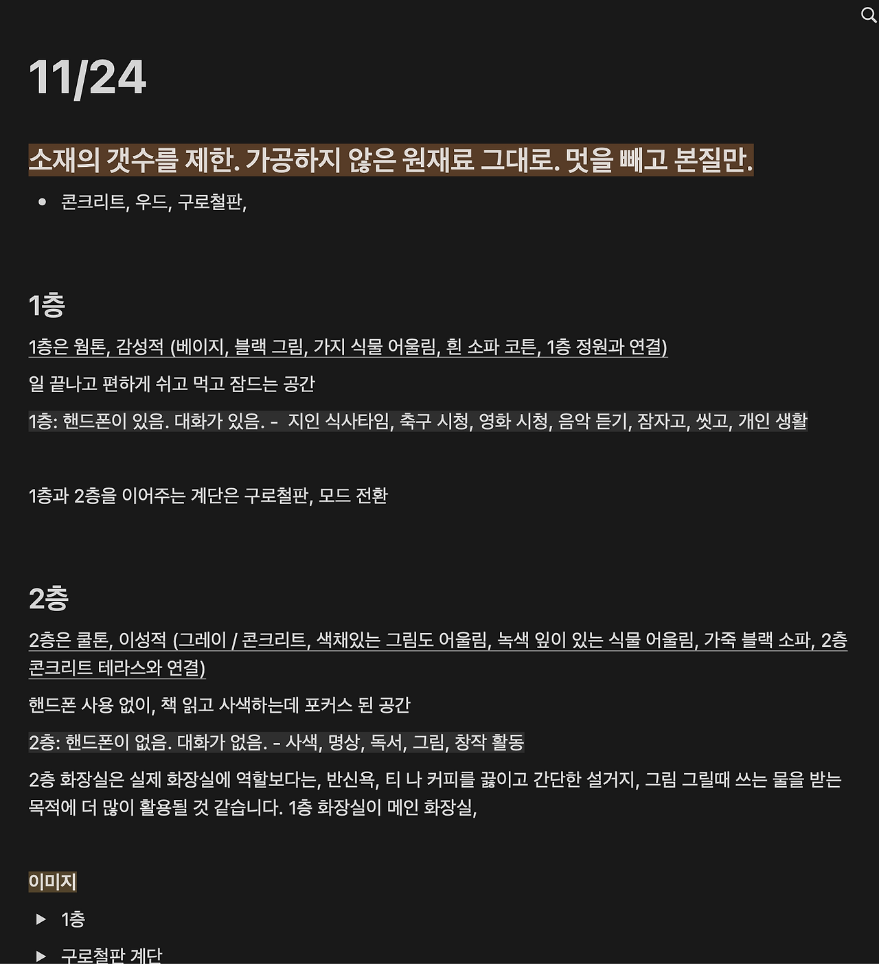 집에 들어갈 가구들의 레퍼런스들을 보러 학동역 가구거리를 뛰어다니고, 내가 생각한 이 집이 담아야 할 철학과 레퍼런스 이미지들을 매일같이 공유하고, 그것들을 소장님은 취합하고 정리하다 보니 설계를 마무리하기로 한 12월 중순에 다다랐다. 그렇게 내 손에 들어온 최종 설계 시안은 그동안 내가 요구했던 모든 것들이 반영되어 있었다. 조금은 오버했지만 처음에 약속했던 견적 안에 들어올 수 있도록 소장님은 신경을 많이 써주셨다. 내가 원한다고 했던 걸 모두 담았고, 공사 견적도 잡아뒀던 예산 안에 들어왔으니 이제 공사로 넘어가면 되는 때였다. 당연히 설레고 기대가 커져야 하는 그 시점에 나는 어느 때보다도 불안하고 불편했다.