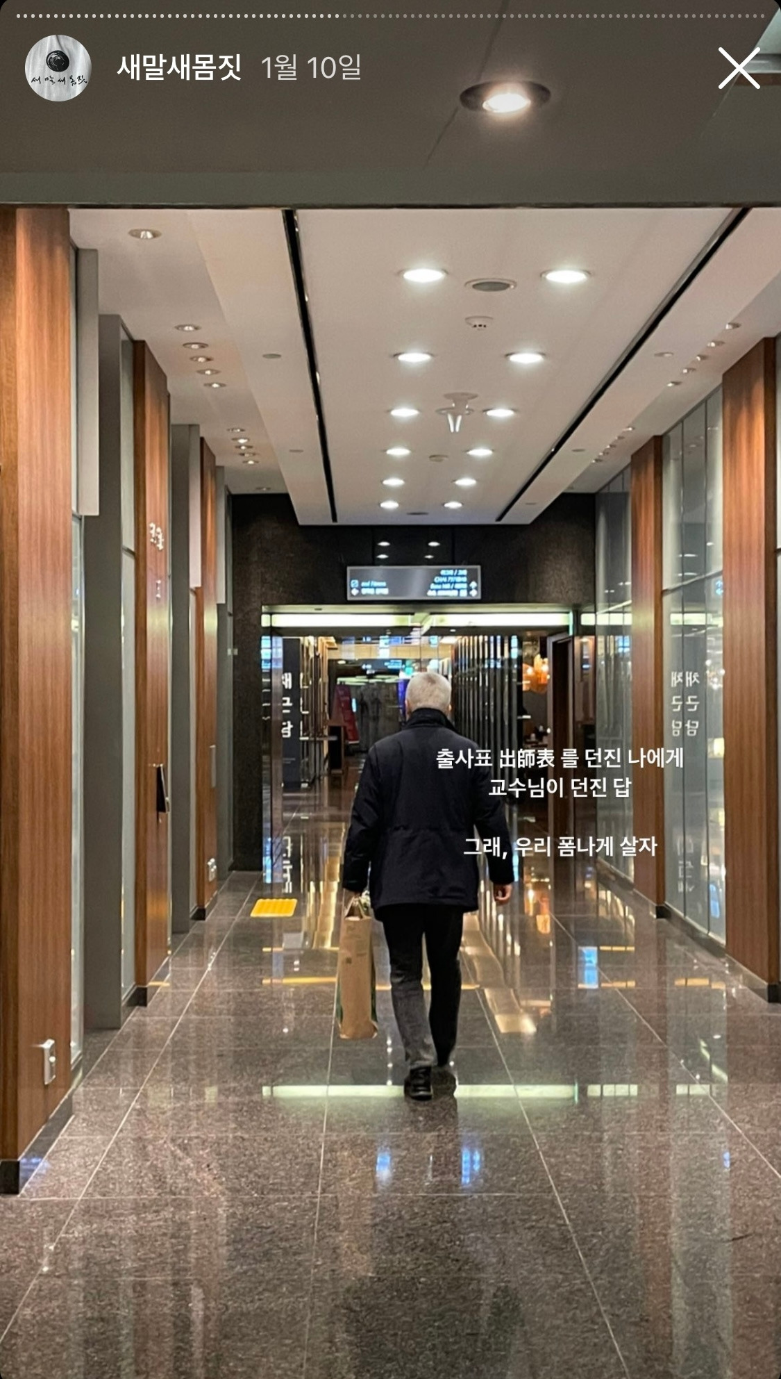 반대로 교수님도 교수님이 어떻게 살고 싶은지. 그래서 죽기 전까지 완수하고 싶은 소명이 무엇인지를 밝혀주셨다. 교수님의 소명도 나의 소명도 완수하기 위해 겪어야 할 시련과 어려움들이 눈에 훤히 보였다. 우리는 그 시련과 어려움에 대해서 한참을 이야기를 했고, 자유와 주체적인 삶에 대해서도 이야기를 한참 나눴다. 시간이 이렇게 많이 흘렀는지 모를 만큼 즐거운 대화였다고 말씀하시며 교수님은 다음 일정을 위한 채비를 하셨다. 준비가 다 되셨는지 일어나시면서, 올곧게 자세를 고치고 눈을 정확히 맞추고 악수를 청하며 말씀하셨다.