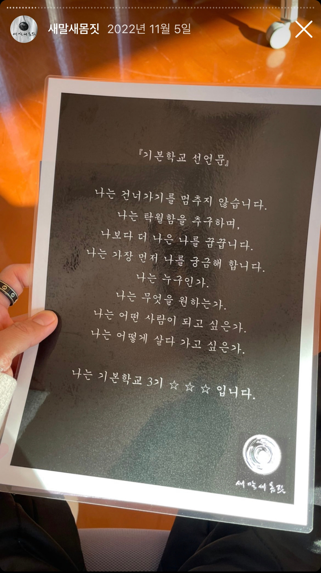그렇게 나는 충실히 따랐다. 10월 말부터 두 달 정도를 함평을 오가는 8시간과 에세이를 쓰는 과정에 그 네 가지 질문에 치열하게 답해보려 애썼다. 기본학교를 오기 전 2년 반 이상을 나를 탐구하는데 발버둥 쳤던 시간들이 나를 많이 도왔다. 이미 찾았던 내 삶의 키워드들과 아직 잇지 못했지만 새롭게 찾은 점들을 연결하고 또 연결하는 시간들이었다. 그러던 22년의 마지막 날 교수님이 말씀하셨던 그것이 말씀 그대로 드러났다.