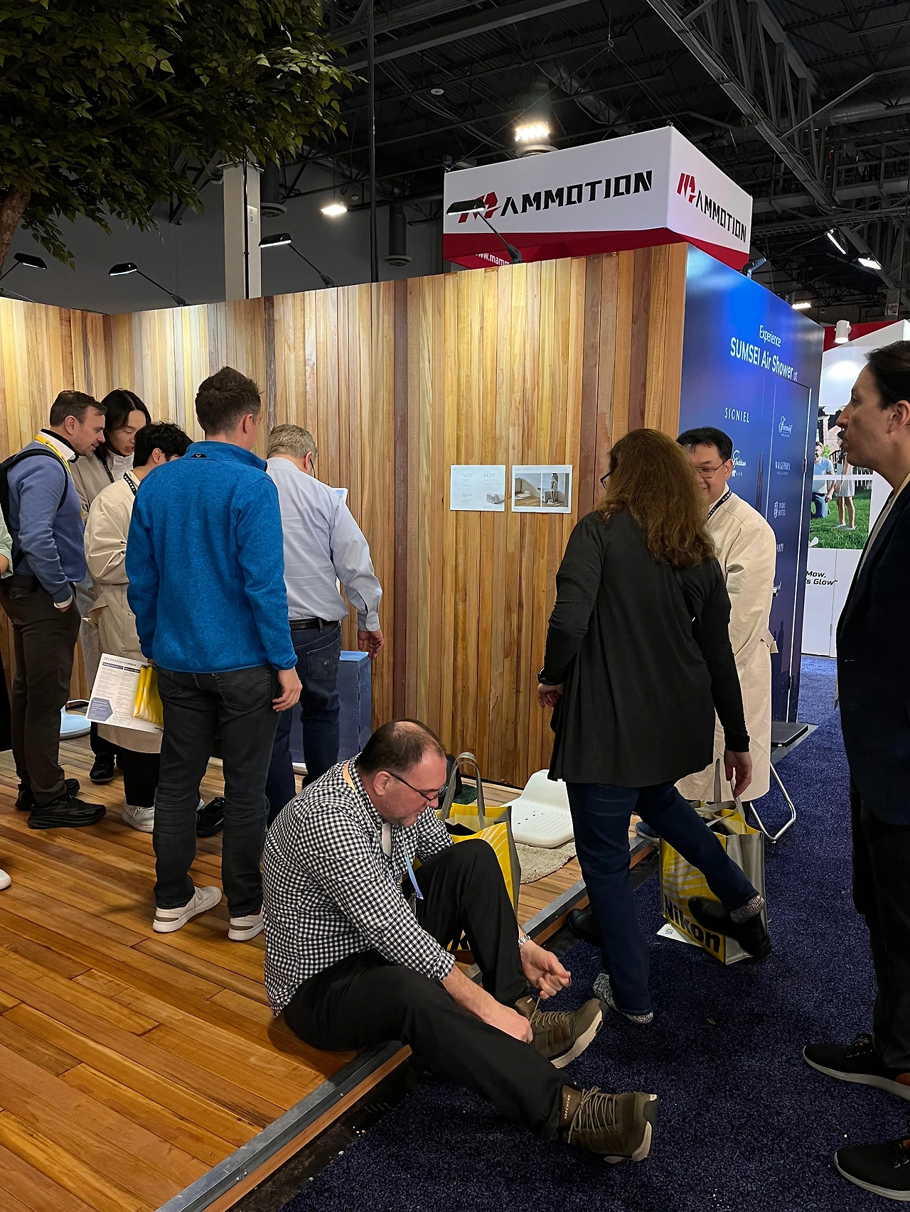 어제와 같은 길이었지만 우리와 같은 수많은 참가업체 사람들이 쏟아지듯 전시장으로 향했다. 세계 무대에 자신의 기술과 제품을 알려보겠다는 마음으로 모인 사람들이라 그런지 에너지가 넘쳤다. 부스 내에 제품들을 ㅎㅈ이 기획한 대로 세팅했다. 문을 열고 들어가면 천장까지 막아 어두운 첫 공간에서 자갈들을 밟으며 지나고, 머드같이 느껴지는 클레이가 깔린 동굴존으로 진입하면 워머들의 불규칙한 빛을 볼 수 있도록 세팅했다. 그다음 두 번째 공간인 모래가 깔린 바다로 들어가면 에어샤워 와 페블탭을 만나 볼 수 있도록 했다. 그곳을 지나면 마지막 공간인 숲에서 6미터짜리 나무와 함께 개발 중인 산소발생기를 체험해 볼 수 있도록 준비했다. 모든 공간에서는 각 공간에 맞는 사운드와 향까지 ㅎㅈ이 준비했다. 다만 아쉬웠던 건 실제 공간들에 돌과 모래, 바크들이 깔려 있다 보니 맨발로 다니다가 다치기라도 한다면 고소의 나라 미국에선 일이 커질 수도 있다는 ㅎㅈ의 판단에, 신발을 신고 경험하는 방향으로 타협한 부분이었다.