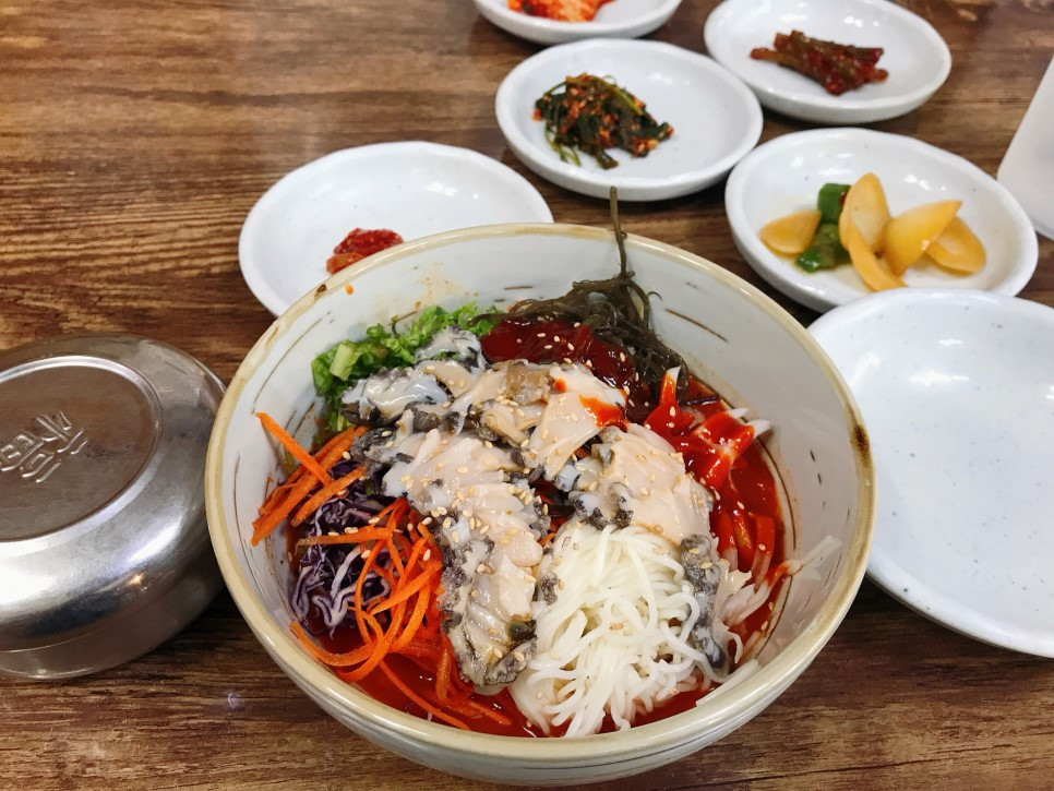 땀을 꽤 흘린 후라서 목이 몹시 마르고 배도 고팠다. 성산일출봉 근처에 식당과 상점들이 많이 있긴 했지만 어쩐지 붐비는 곳에 가기 싫은 기분이었다. 시원한 물회를 먹을 참이었다. 검색을 통해 알게 된 '장승포 식당'이라는 곳이 멀지 않은 곳에 있었다. 주메뉴는 전복 물회. 시원하고 새콤한 맛에 오도독 전복의 식감이 어우러져 등산의 피로를 싹 날릴 수 있었다.