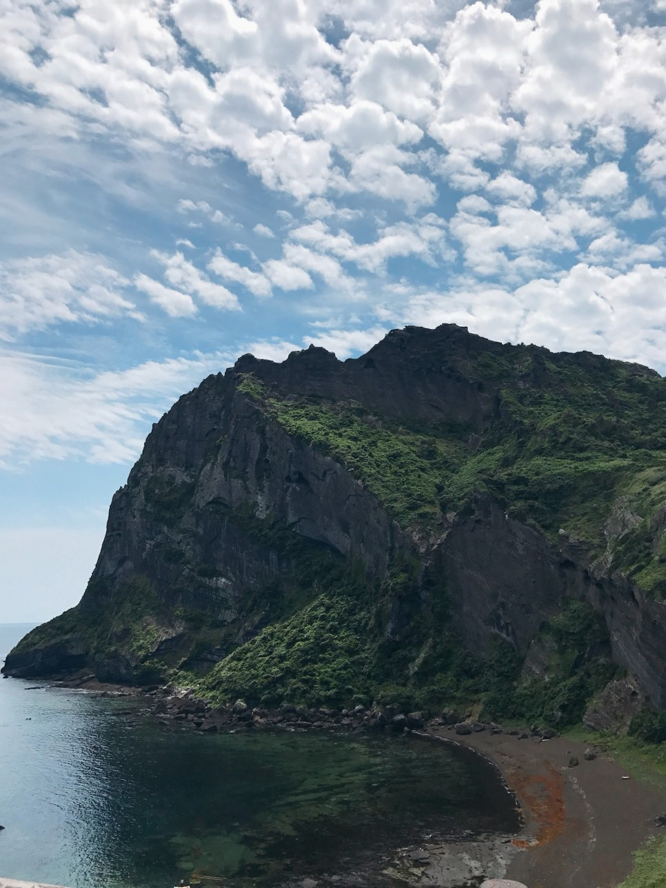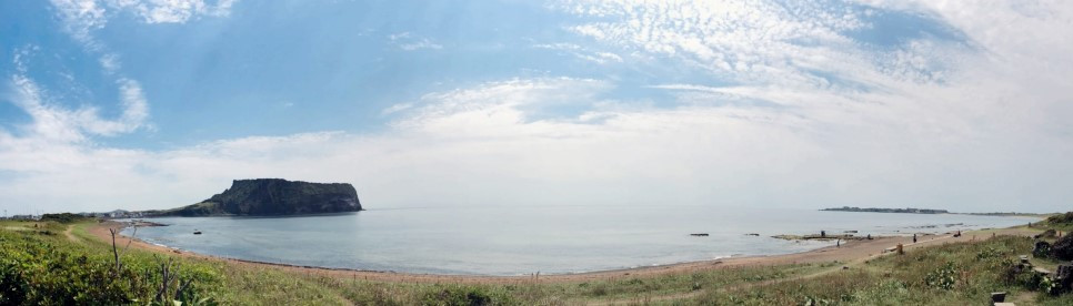 제주 동부에 툭 튀어나온 지형으로 가는 길에는 성산포 공원이 널찍하게 바다와 맞닿아 있다. 잠시 차를 세우고 멀리 한눈에 들여다 보이는 성산일출봉의 모습을 바라봤다. 날씨가 맑아 더욱 투명한 바다와 하늘 사이로 짙푸르고 평평한 땅이 솟아있고, 그 주위를 구름이 감싸고 있었다. 이곳에서만큼은 분명히 자기가 주인공이라는듯한 당당한 위용이었다.