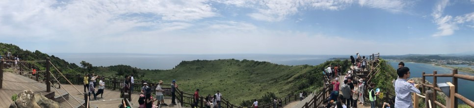 정상에서는 바다를 배경으로 분화구의 넓은 모습이 펼쳐져 있다. 여기저기 사진을 찍는 사람들 사이로 장소를 바꿔가며 성산일출봉 꼭대기에서의 풍경을 마음껏 즐겼다.