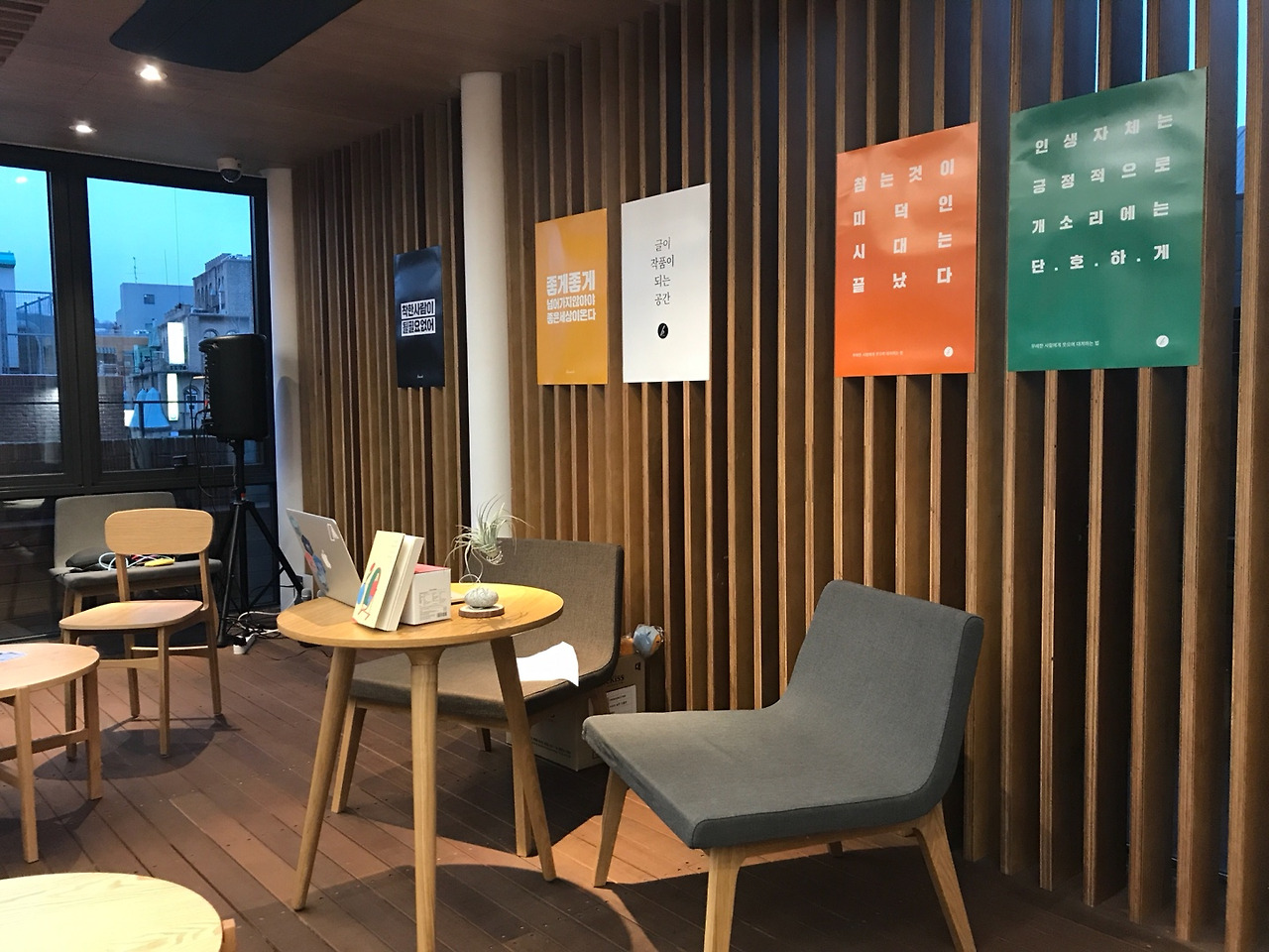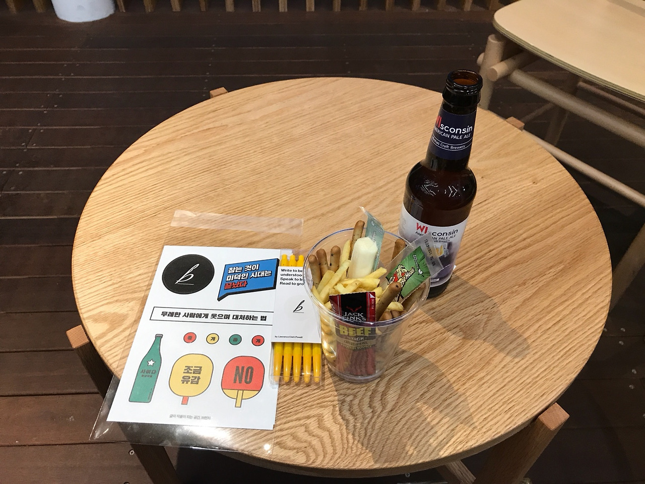 약간 일찍 도착했다. 예상했던 것과는 조금 다른, 작가님을 바로 코 앞에서 볼 수 있을 공간은 처음 방문한 장소였지만 꽤나 편하게 느껴졌다. 브런치팀 스탭분들이 포스터를 붙이고 참석자를 확인하며 조금은 분주한 가운데 나는 자리를 잡고 앉았다. 소소한 간식과 맥주, 예고된 선물들이었으나 막상 받고 보니 더 고마웠다. 시간이 시간인지라 미리 간단한 요기를 하고 갔기 때문에 목만 마른 상태였던지라 주위를 두리번거리며 맥주를 홀짝였다. 옆에 앉으신 어떤 분의 낯가림 없는 건배 제의에 반갑게 짠도 한 번 하고.