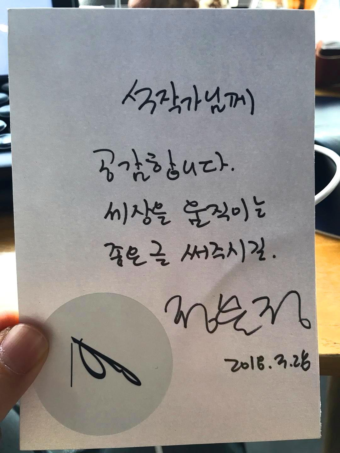 마침 엊그제 여자 친구에게 책을 빌려준 탓(덕분)에 저서 앞장에 싸인받지 못하는 아쉬움을 작가님께 말했는데 경황없던 와중에 그녀가 기억하실는지. 나만의 '일기' 에 머묾이 아닌 타인에게 향하는'편지'를 얘기했던 그녀의 말마따나, 모처럼의 좋았던 책과 북토크에 대해 끄적인 나의 이 일기가 언제고 편지가 되어 정문정 작가님에게 가닿을 수 있기를.