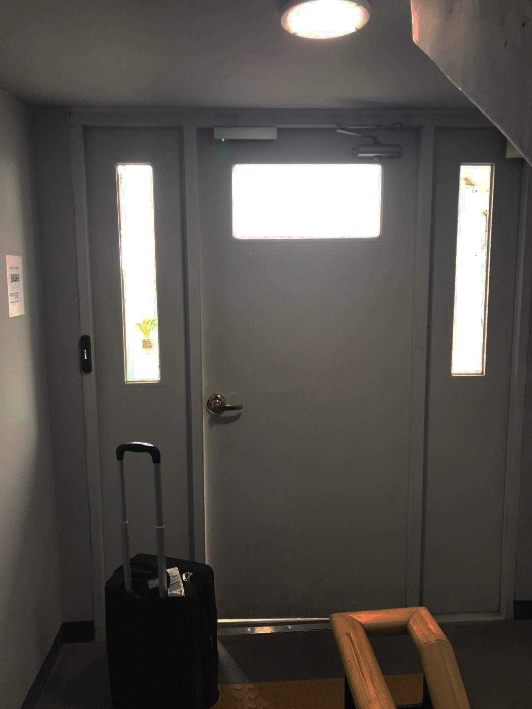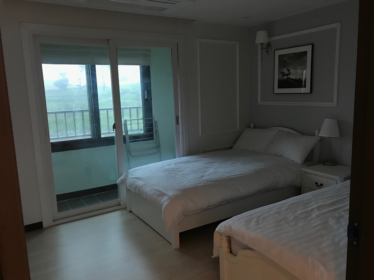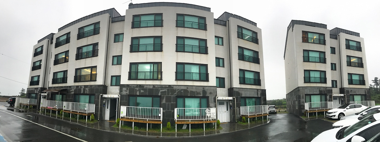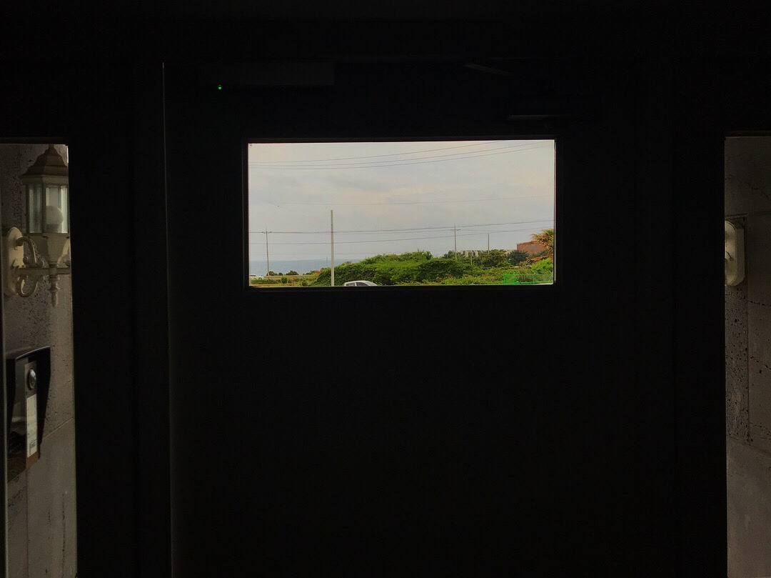 미리 친절한 안내를 받은 덕에(황 팀장님, 현지 매니저님 감사요) 주차 후 짐을 꺼내어 바로 들어갈 수 있었다. 예약을 확인하고 열쇠부터 받아야 하는 일반적인 펜션의 체크인에 비해 확실히 젊고 세련된(?) 인상을 받았다. 두 동 건물 자체의 외관은 수수했으나 하얗게 칠해진 현관 입구에서는 왠지 모를 설렘 같은 걸 느꼈다. 문 위의 작은 창을 통해 밖을 바라보니 바다와 숲이 그림처럼 눈에 박혔다.