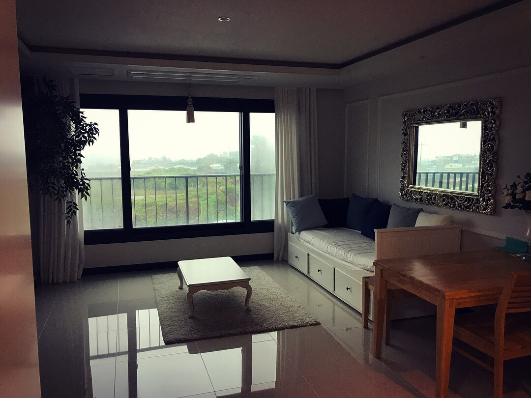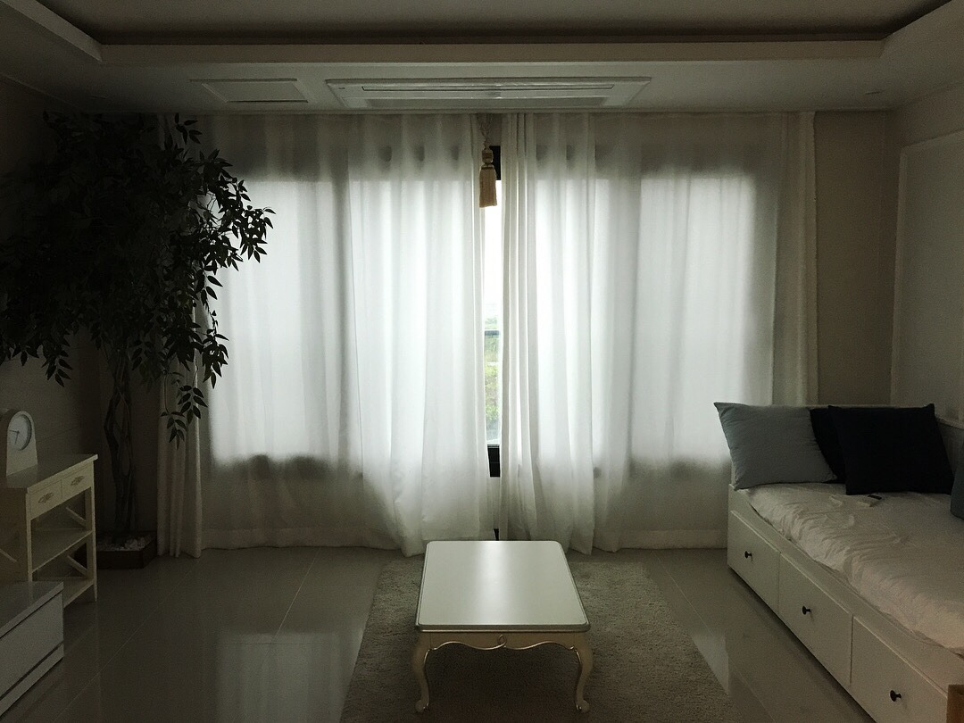 그런 면에서 레몬하우스 거실의 깔끔함은 이곳이 한 달을 지내기 충분하도록 준비된 공간이구나 라는 생각이 들도록 해 주었다. 먼저 눈에 들어오는 넓은 창이 시원해 보였고, 탁자며 거울뿐만 아니라 부엌 사이에 놓인 테이블의 배치가 좋았다. 펼치면 2인이 눕기에 충분한 소파베드에 털썩 앉아보니 푹신하니 무척 편했다. 벽이며 가구, 바닥의 대리석까지 전체적으로 화이트 톤이라서 더욱 깔끔하게 느껴지는 공간이었다.