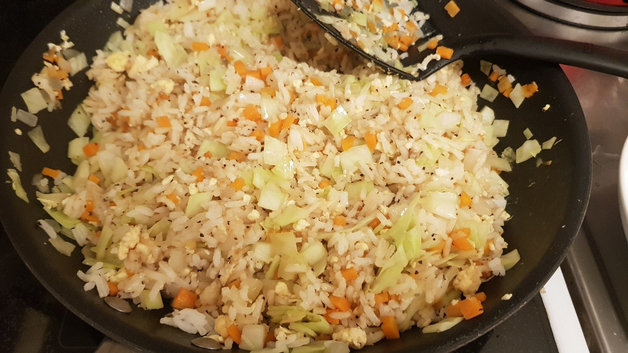 냉장고에 있는 채소들을 다져서 볶고 밥을 같이 볶다가 후추를 넣는데 구멍을 잘못보고 큰 구멍 쪽을 열어서 톡톡 뿌리다가 훅 나와버렸다.