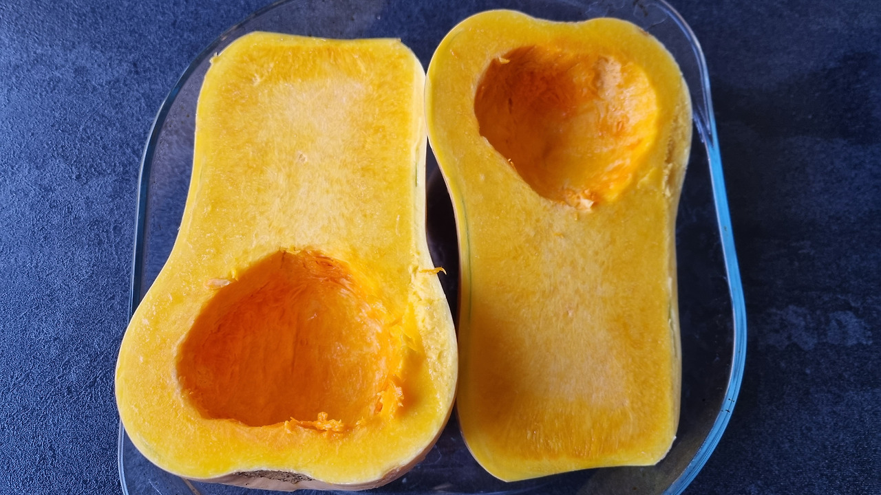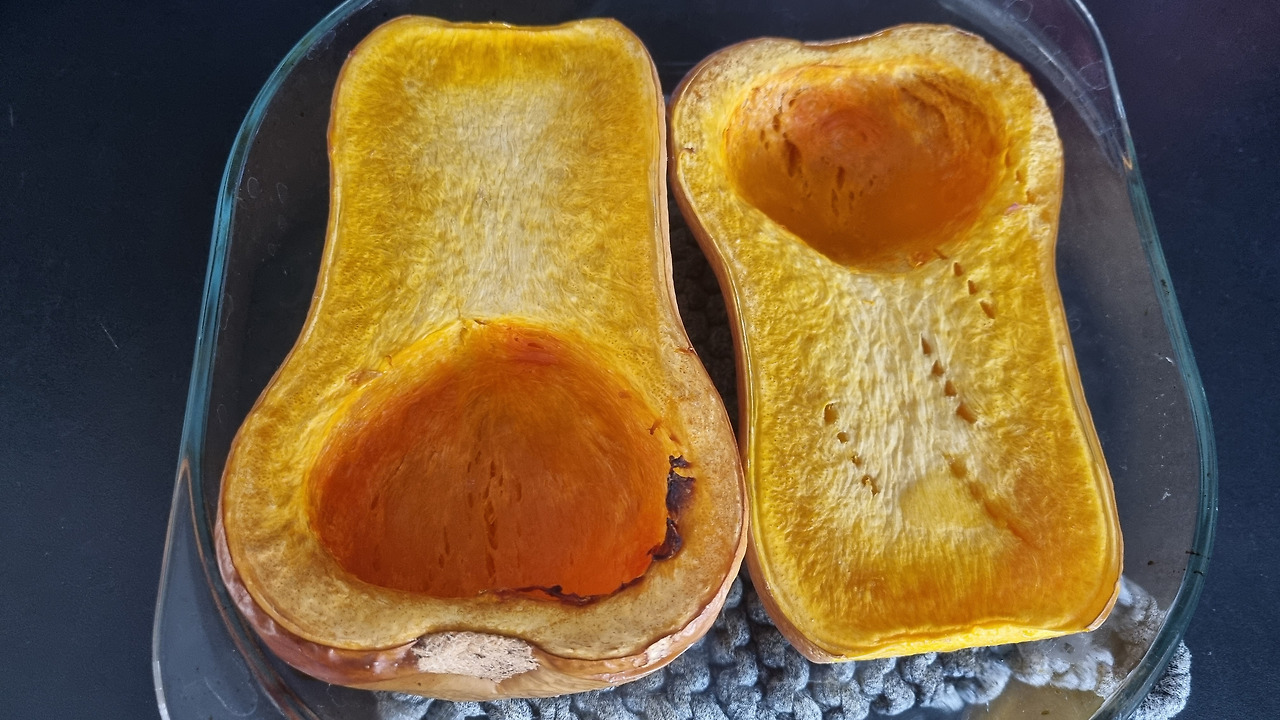 반 갈라서 속을 파내고 오븐에 물렁해질 때까지 구웠다. 반 잘린 단면이 아래로 가게 구웠어야 수분이 덜 빠지고 촉촉하게 구워지는 데 실수로 반대로 놓고 구웠더니 말랐다...조금