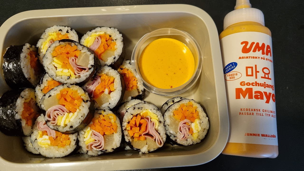 여긴 김밥햄처럼 네모로 두툼한 햄이 없어서 얇은 샌드위치햄을 돌돌 말아서 넣었다.