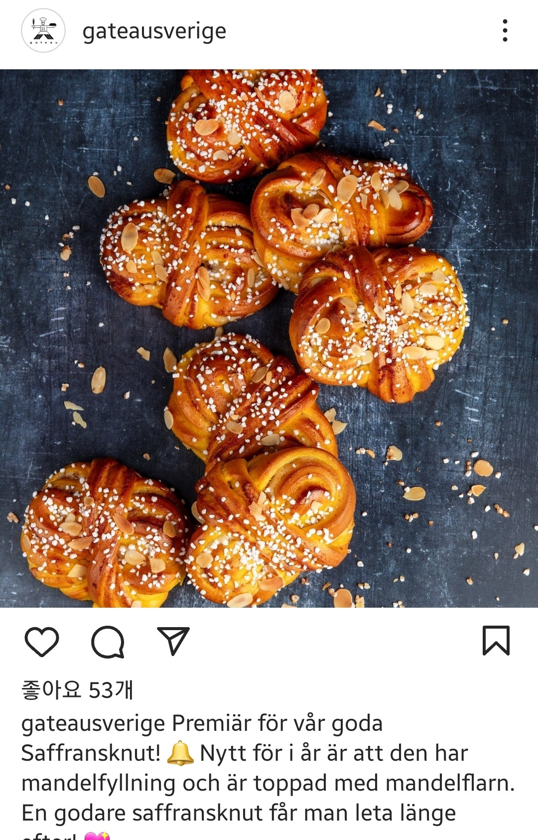 샤프란크누트, 샤프란불레, 루세카테르 등 다양한 이름으로 불리는 이 노란 빵이 보이면 스웨덴의 겨울이 왔다는 걸 미각으로도 느낄 수 있다.