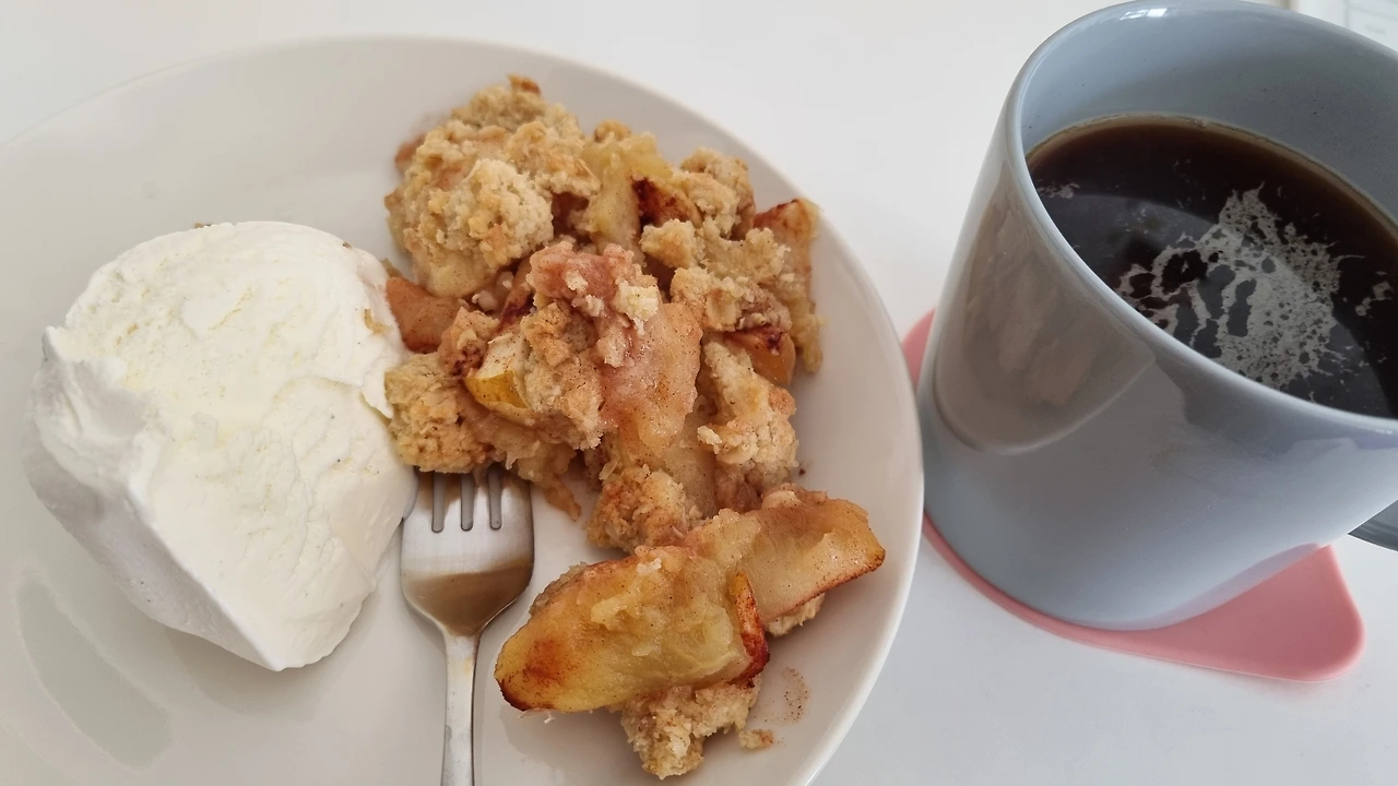 그냥 먹어도 맛있지만 이렇게 애플크럼블로 구워 먹는 것도 별미인 것 같다. 내 손으로 만든 것보다 남편이 만든 투박한 애플크럼블이 더 맛있게 느껴진다. 바닐라 아이스크림과 아메리카노까지 삼박자가 잘 맞았다.