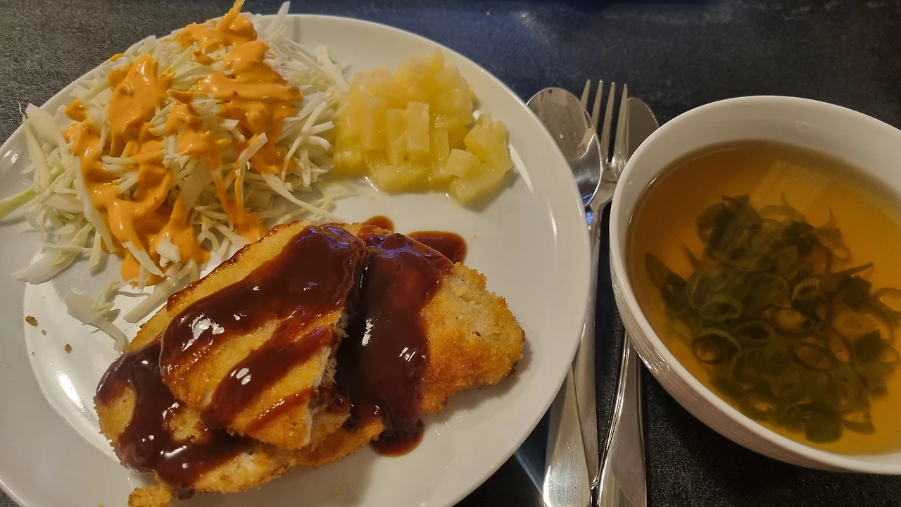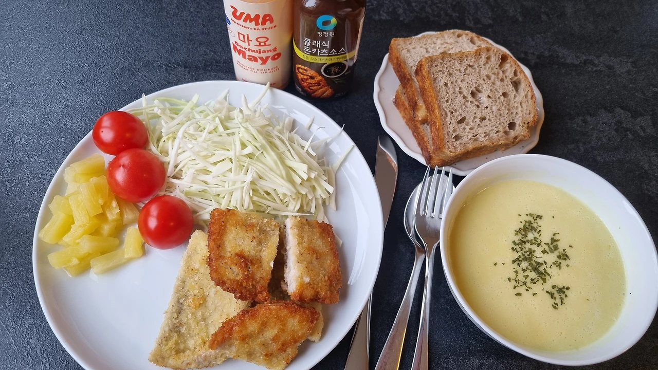 남편한테 남은 돈까스를 튀겨서 한상 차려줬다.